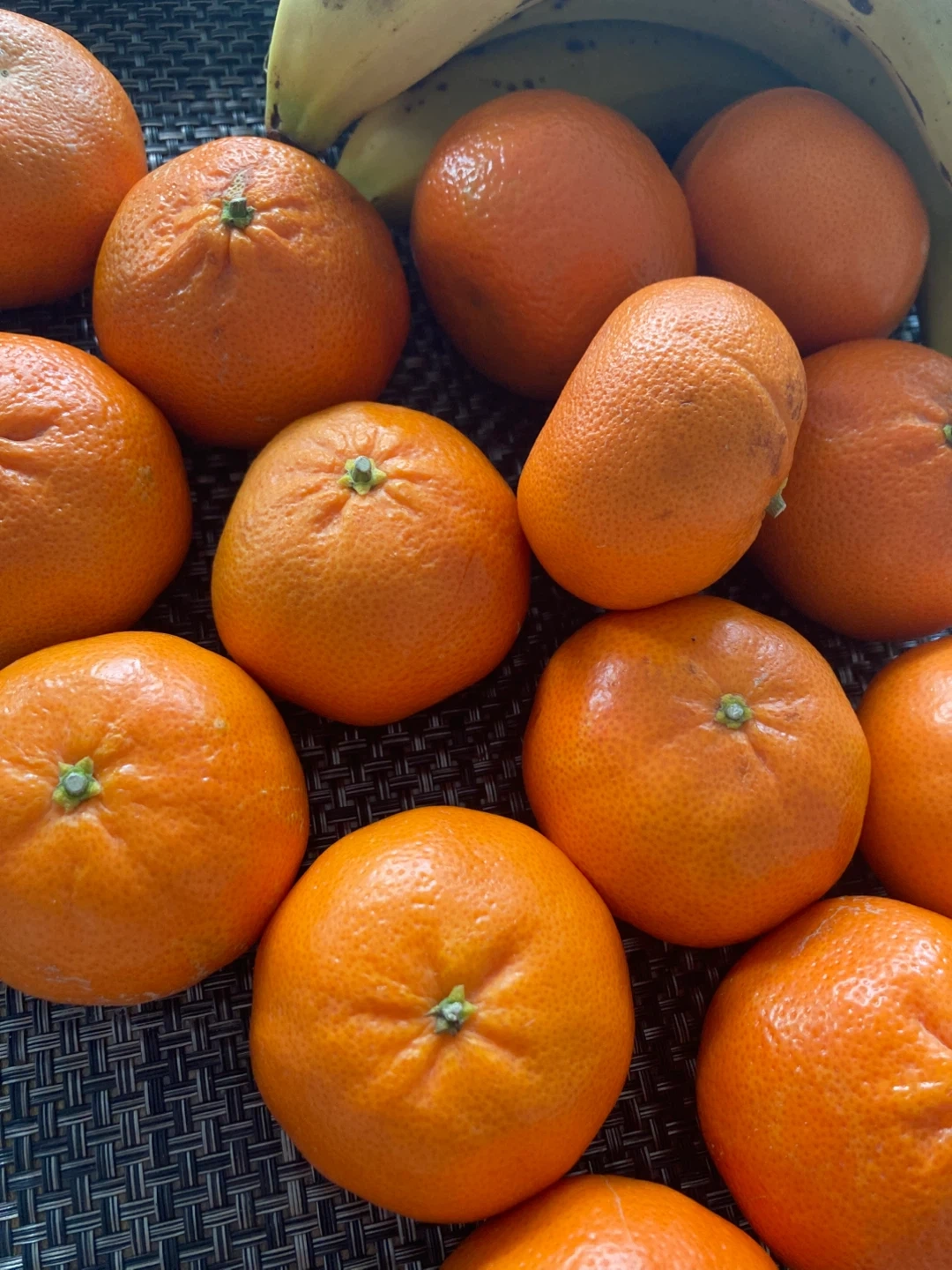 A bag of fresh mandarin oranges and bananas. These are great for a healthy snack.