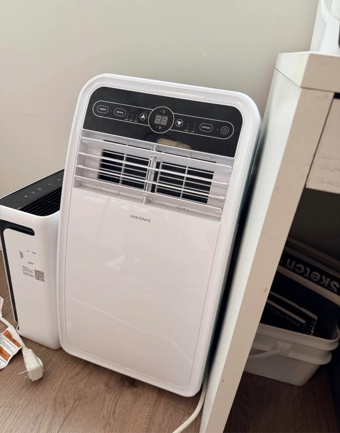 This is a white Insignia portable air conditioner. It has a digital display with timer, mode, temperature, and speed controls. This unit is great for cooling personal spaces.
