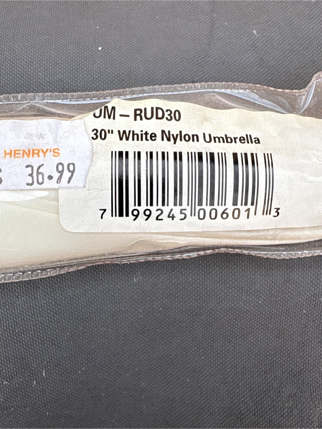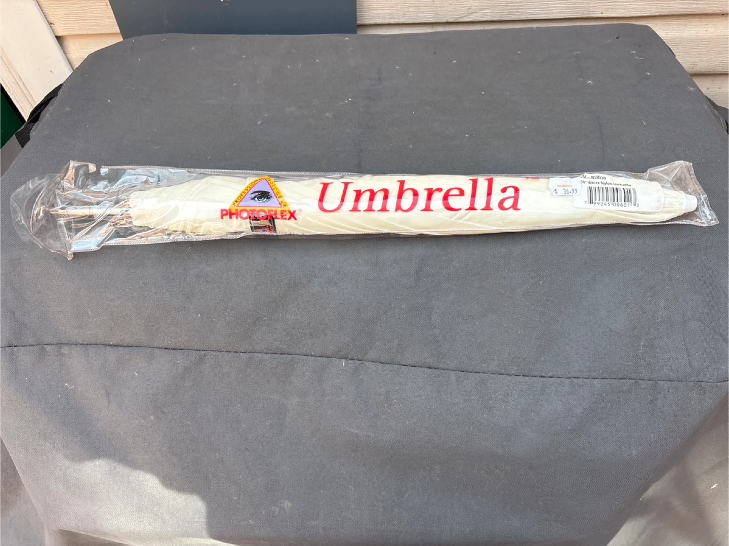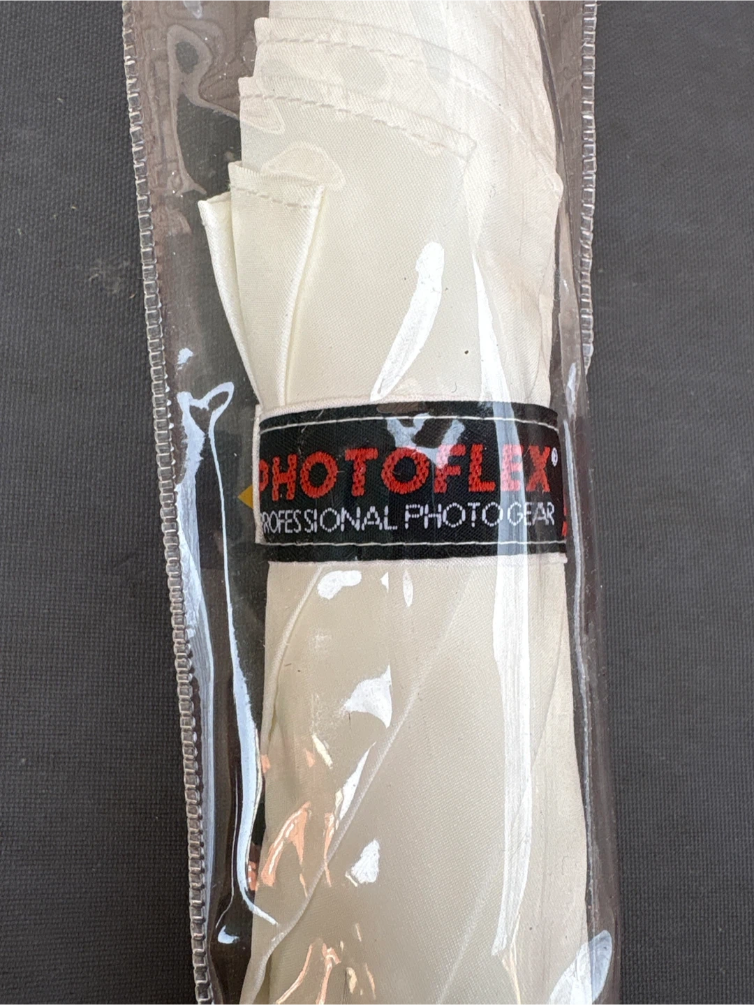 Photoflex 30" white nylon umbrella. It comes in its original packaging. This umbrella is great for photography lighting diffusion or as a rain umbrella.