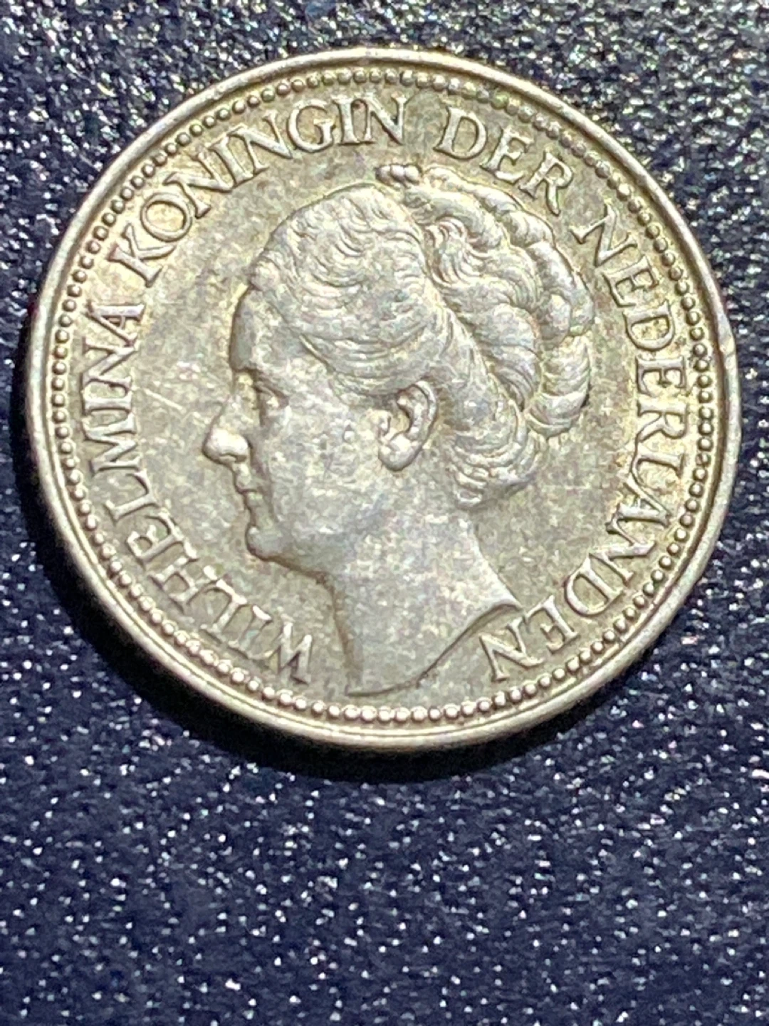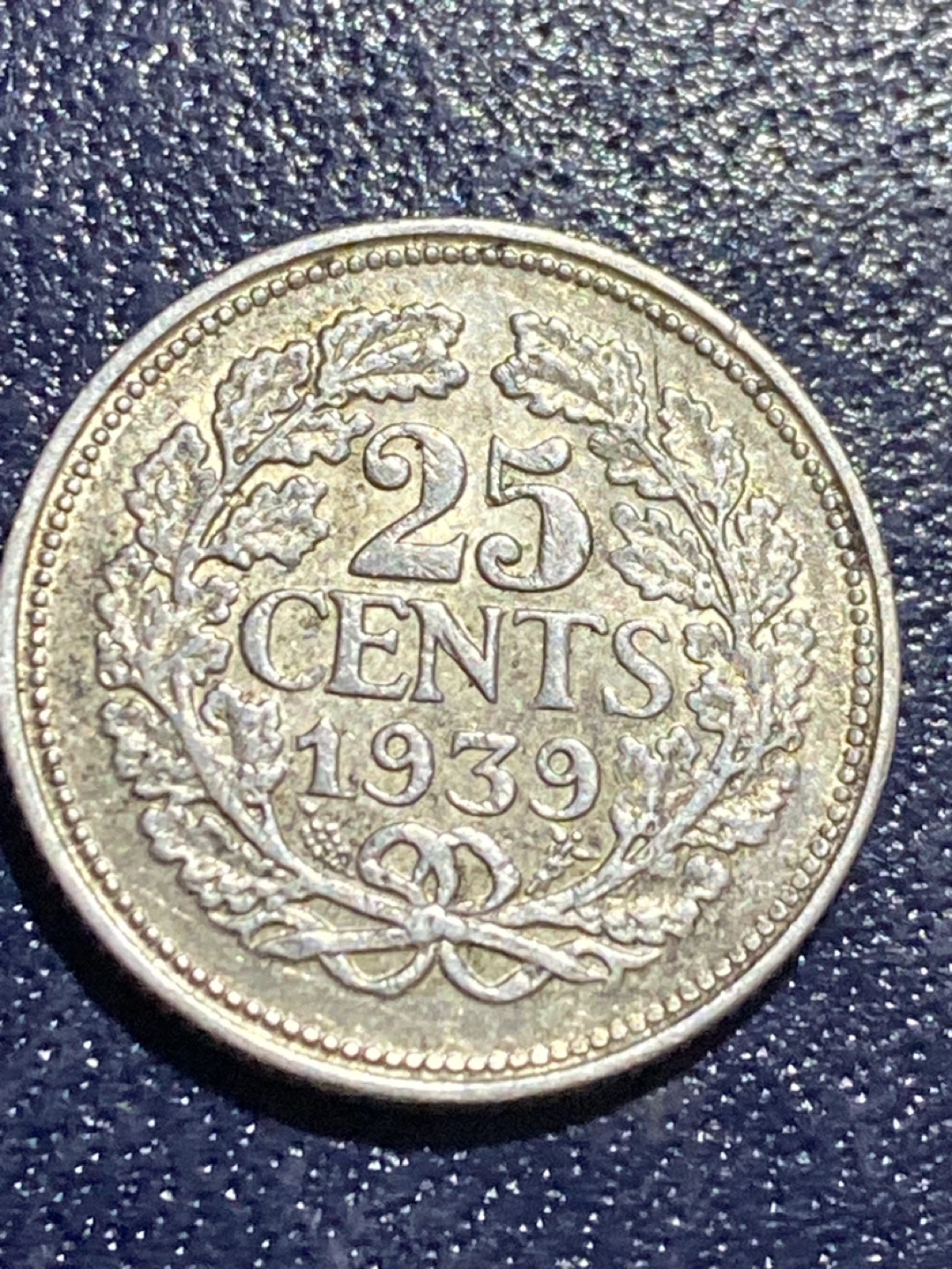 This is a 1939 silver 25 cents coin from the Netherlands. It features Queen Wilhelmina on one side and the denomination with a laurel wreath on the other. A nice piece for collectors!