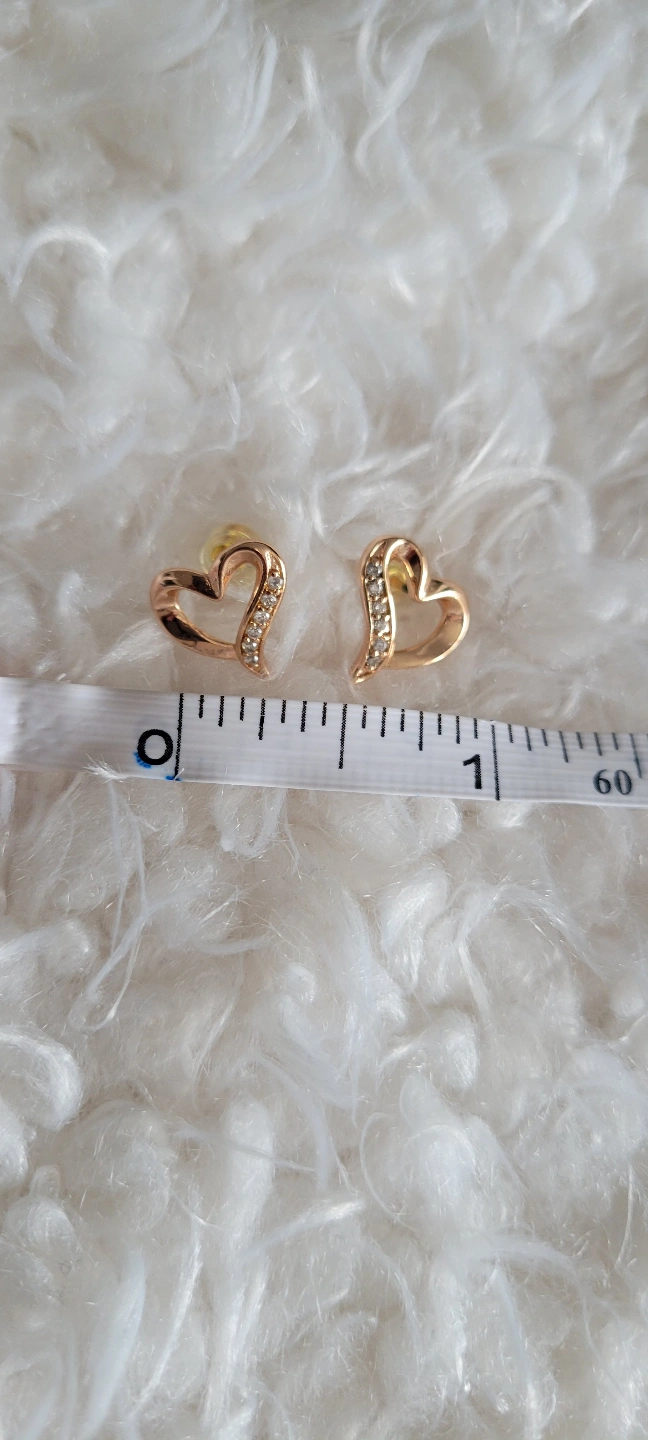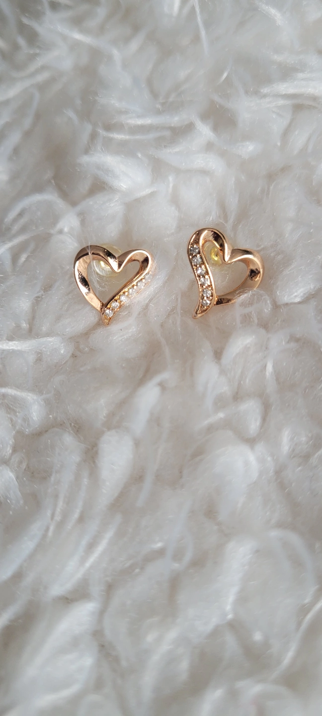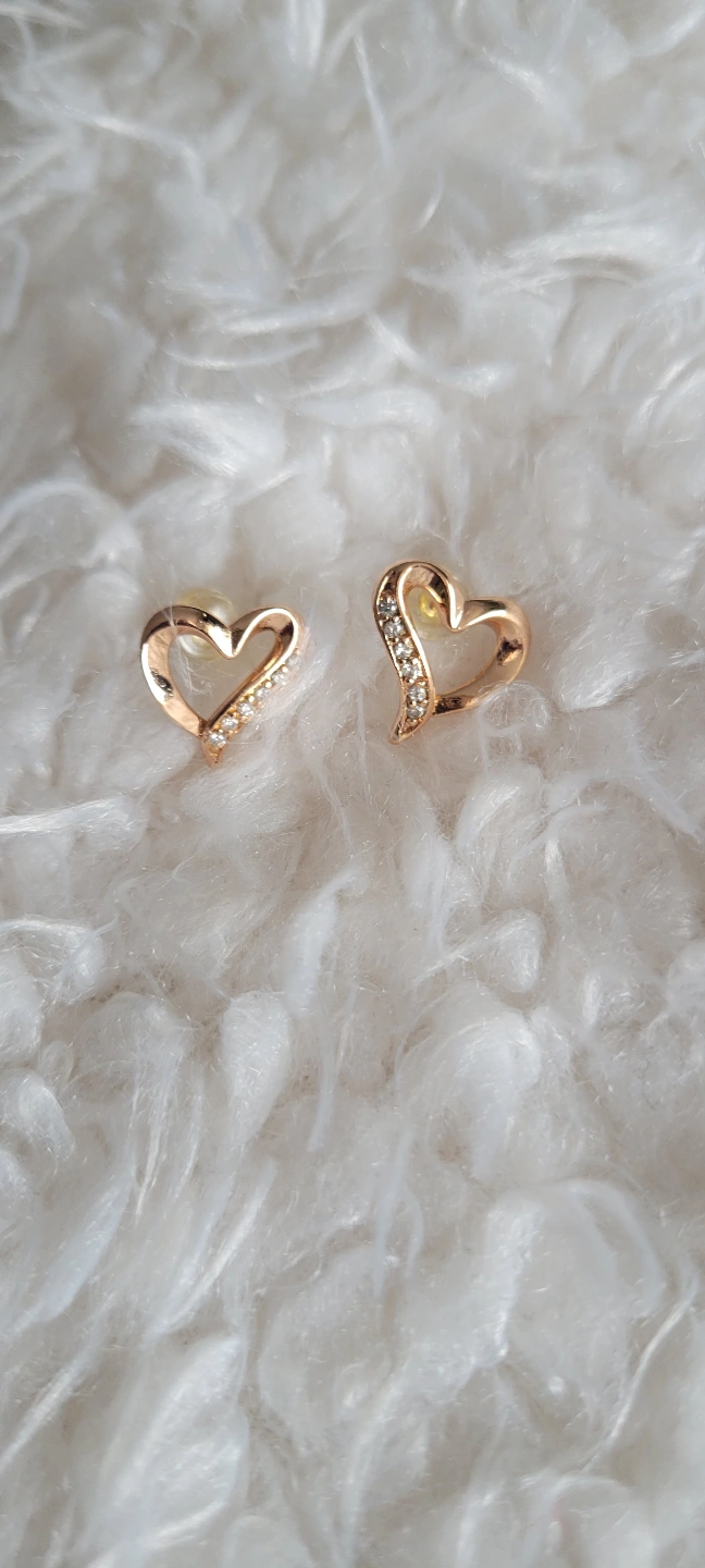 Lovely pair of 18k rose gold-filled (not stamped) heart-shaped stud earrings. Features sparkling cubic zirconia stones. Small and delicate design. Perfect for everyday wear.
