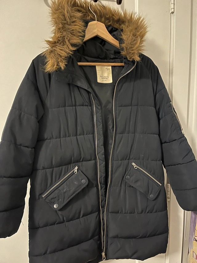 Keep your little one cozy with this used Zara Girls black winter coat, size 13/14 (164 cm). This stylish and warm coat is perfect for chilly days. It's in great condition and ready for a new home! Key features: - Brand: Zara Girls - Size: 13/14 (164 cm) - Colour: Black - Style: Winter Coat. I've priced it competitively at $30. Just a heads-up, if you're seeing this ad, the coat is still up for grabs! It's waiting for a new owner to embark on exciting winter adventures.
