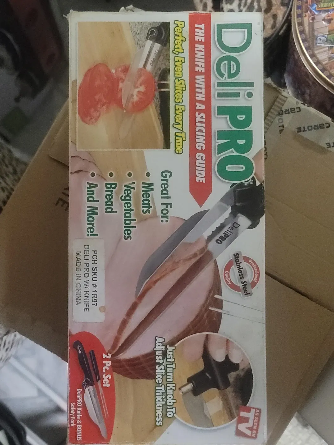 This is the DeliPRO knife with a slicing guide. It's great for slicing meats, vegetables, and bread. Features stainless steel construction and an adjustable slice thickness knob.