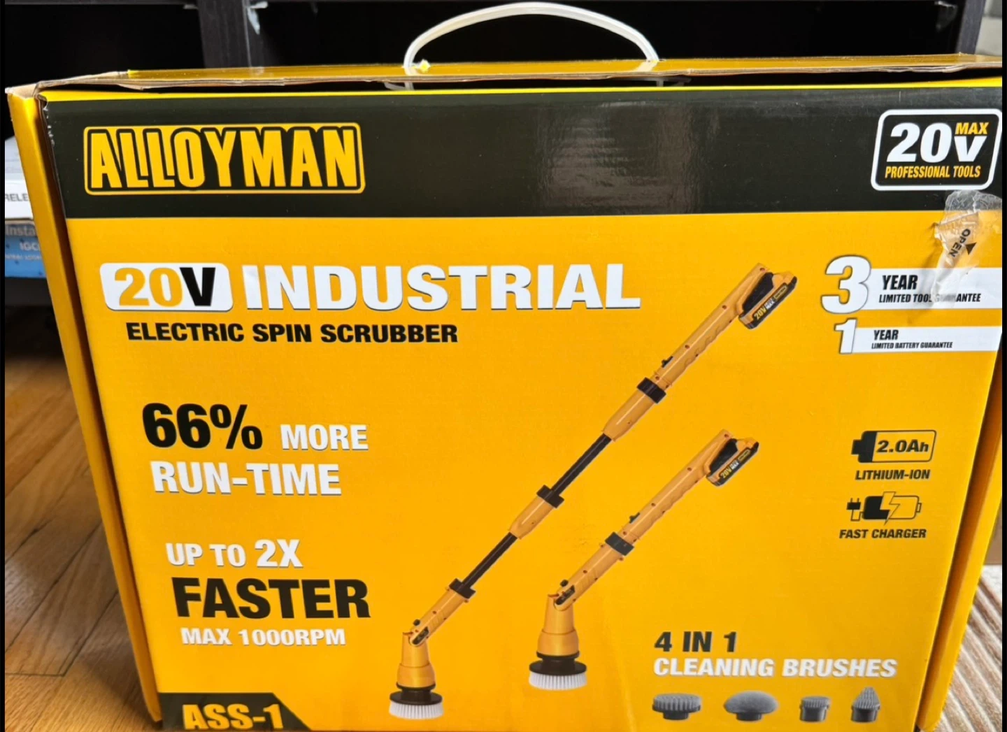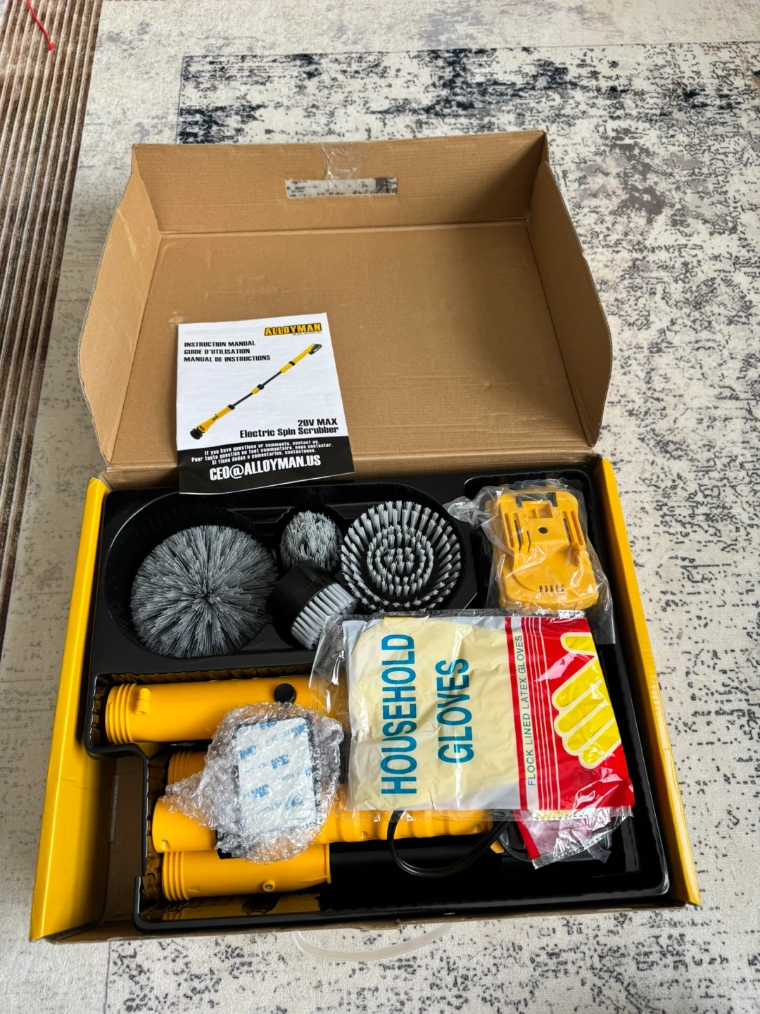 This is the ALLOYMAN 20V Industrial Electric Spin Scrubber, model ASS-1. It comes with 4-in-1 cleaning brushes and household gloves. It features up to 2x faster cleaning with 66% more run-time.