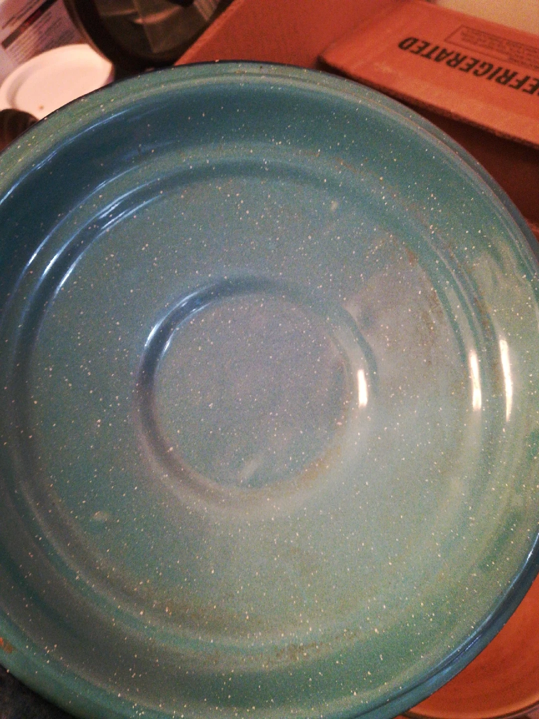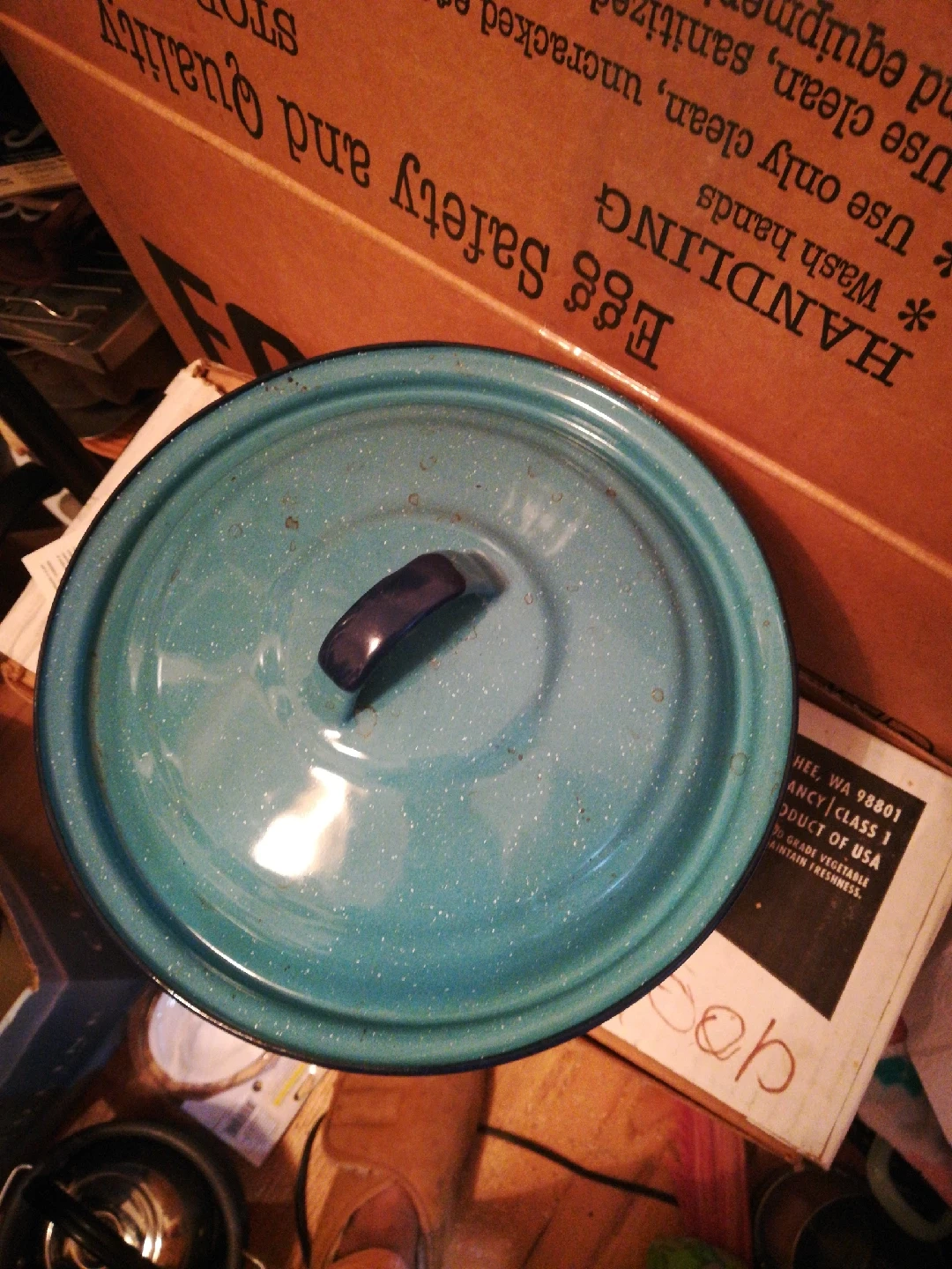Selling a vintage enamelware cooking pot with a lid. It's a beautiful light blue color with white speckles on the inside. The pot features a floral design on the outside. Great for cooking or as a decorative piece!