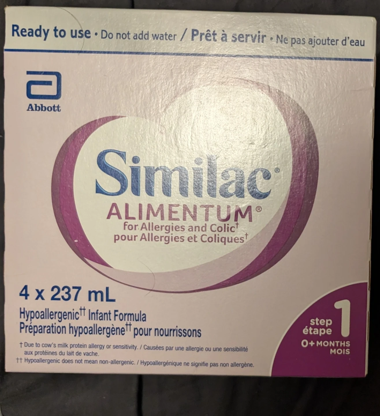 New Similac Alimentum hypoallergenic infant formula for allergies and colic. Ready to use. Includes four 237 mL bottles. Step 1 formula for 0+ months. Expiry May 2026