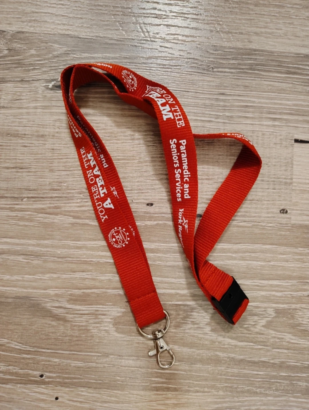 Brand New Red lanyard that says "YOU'RE ON THE A TEAM" and "Paramedic and Seniors Services of York Region". It has a metal clasp and black clip.
