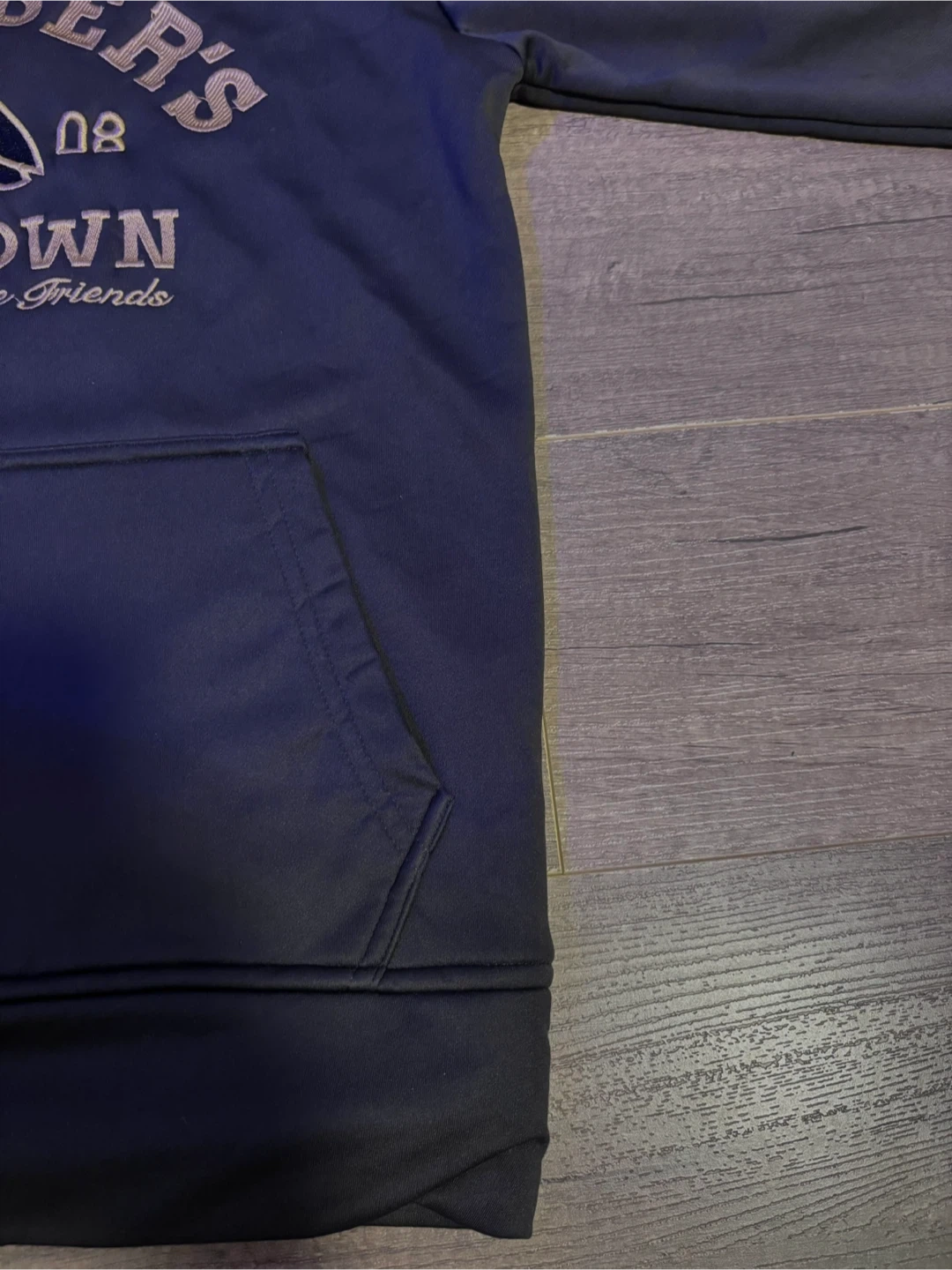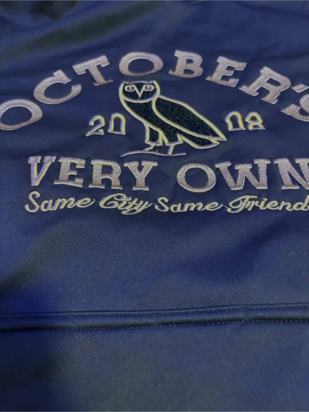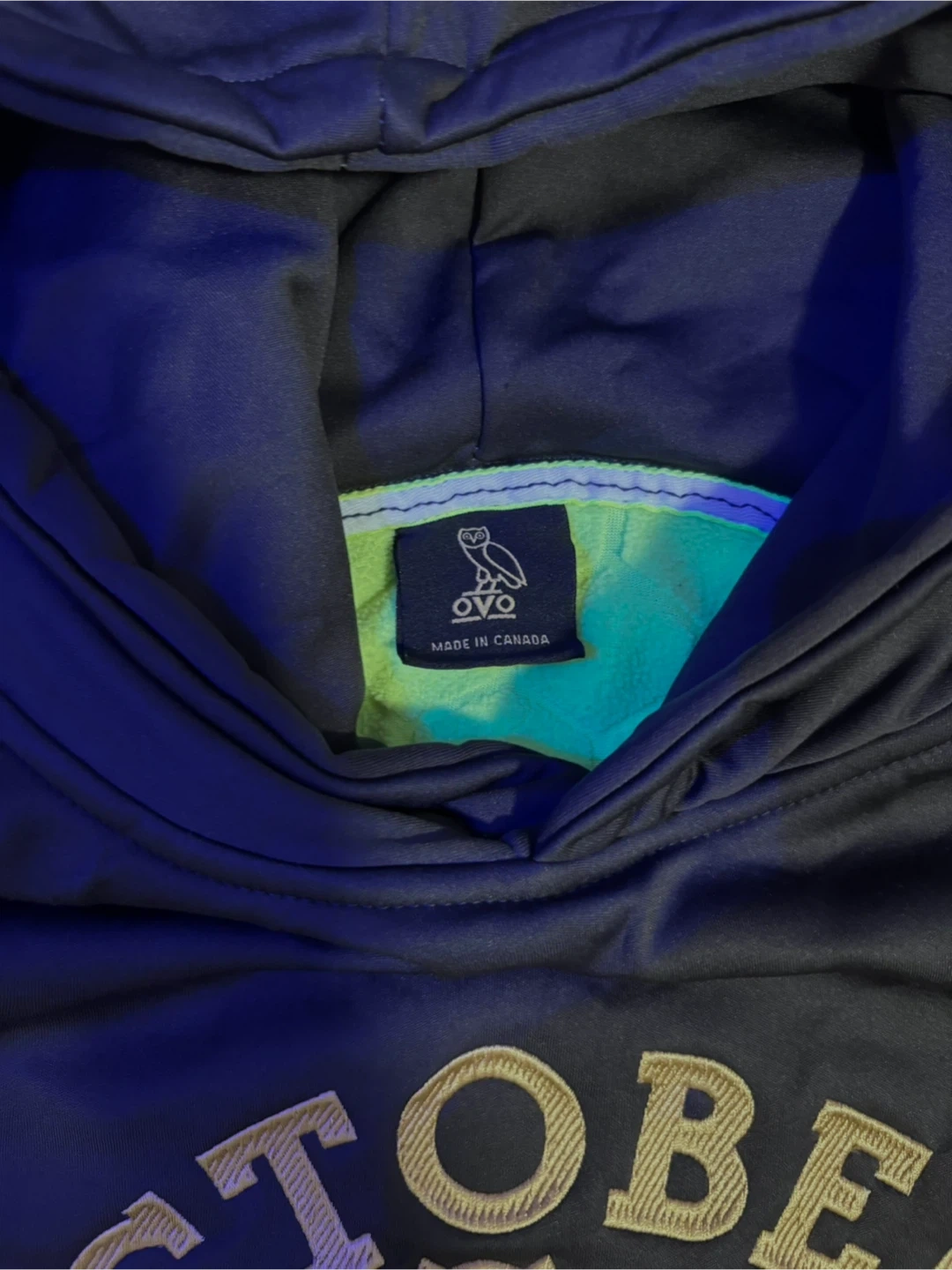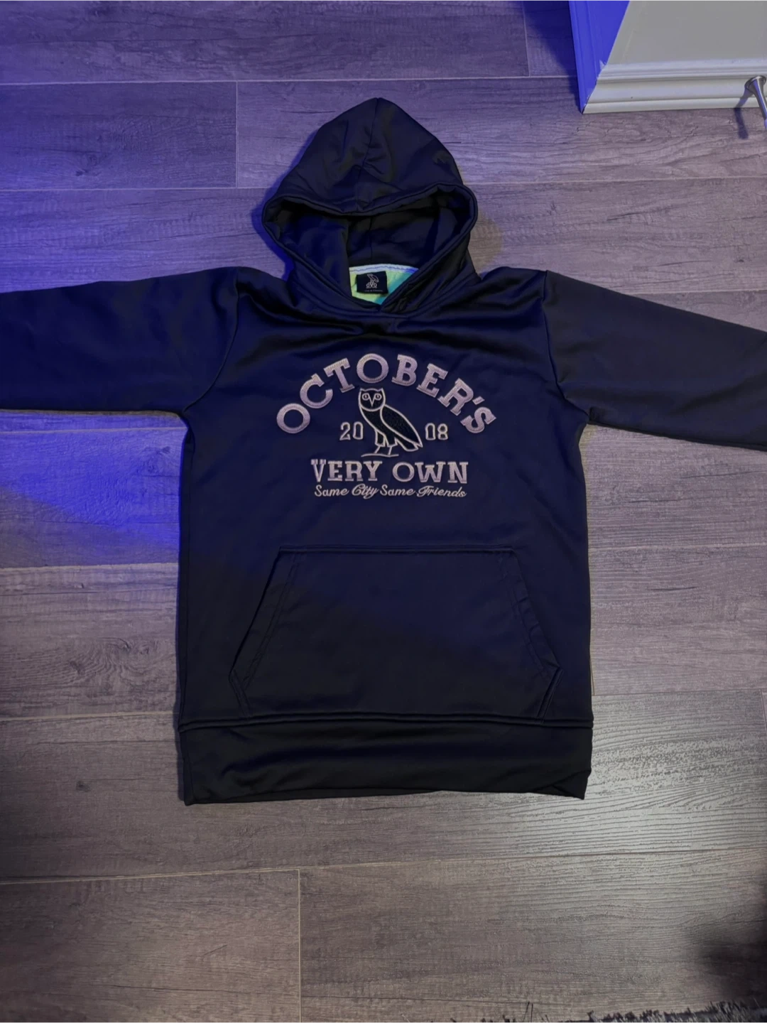 This is an OVO hoodie with "October's Very Own" printed on the front. It's made in Canada and features the iconic owl logo. It's a comfortable pullover style with a front kangaroo pocket. This hoodie is great for casual wear.