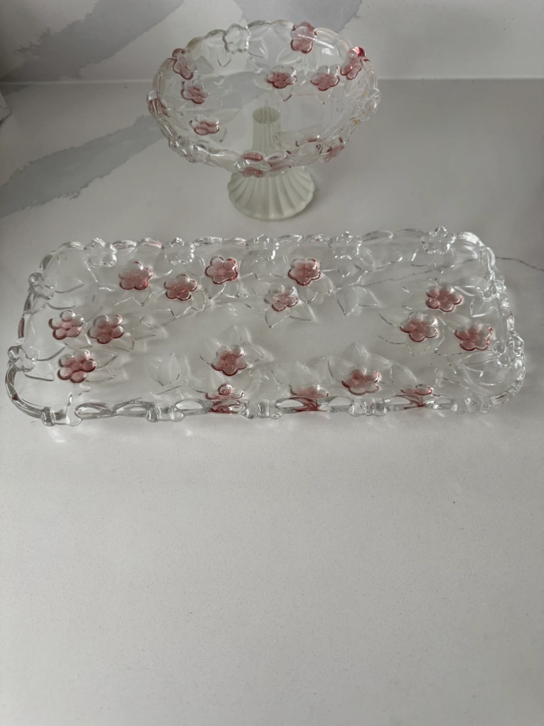 This is a beautiful two-piece crystal serving set by Waltherglas. It includes a footed bowl and a rectangular tray, both adorned with delicate pink floral accents. Made in Germany, this set's clear glass and intricate design would make a lovely addition to any table setting! Pick up near Steeles and Bathurst intersection