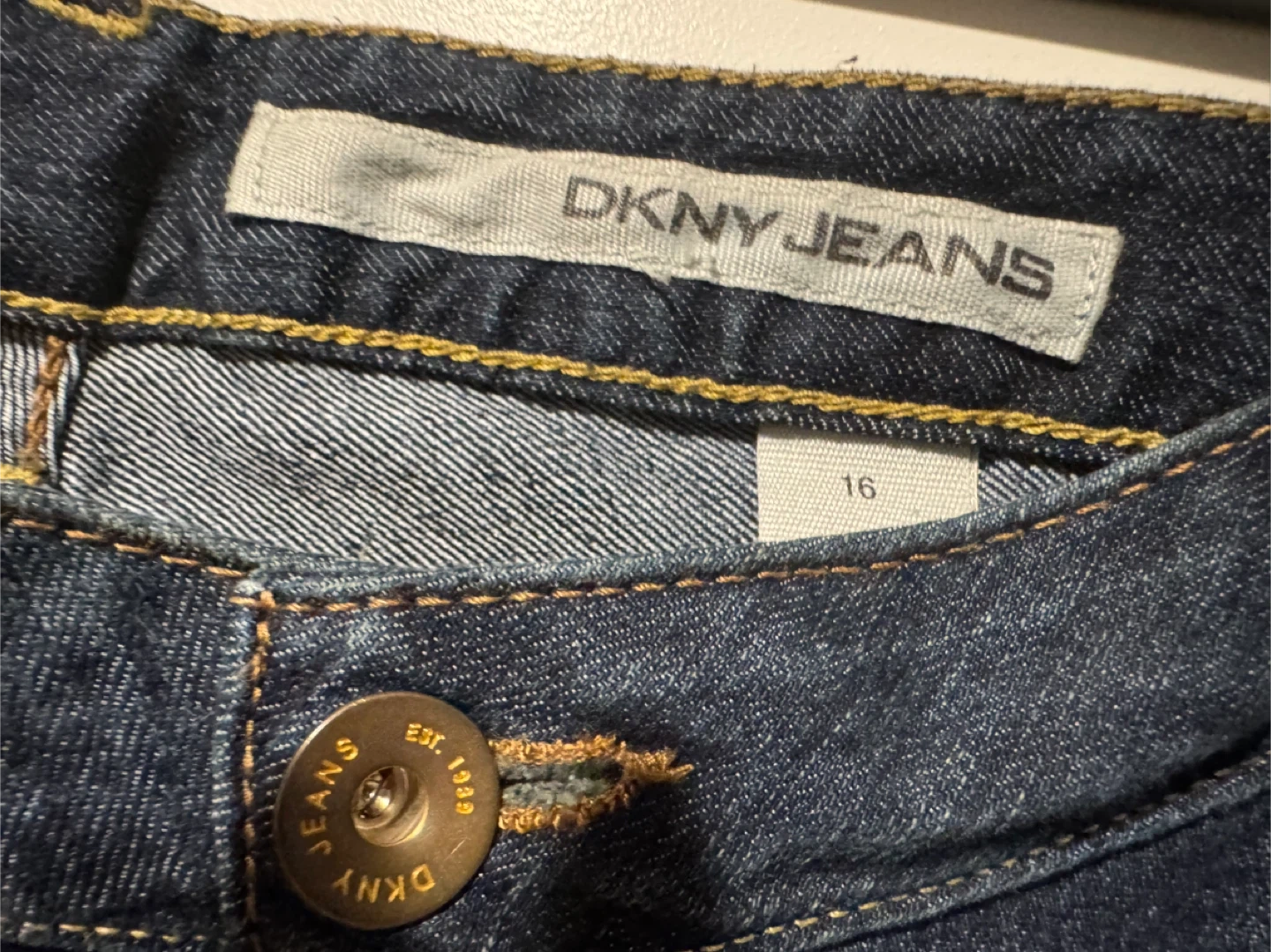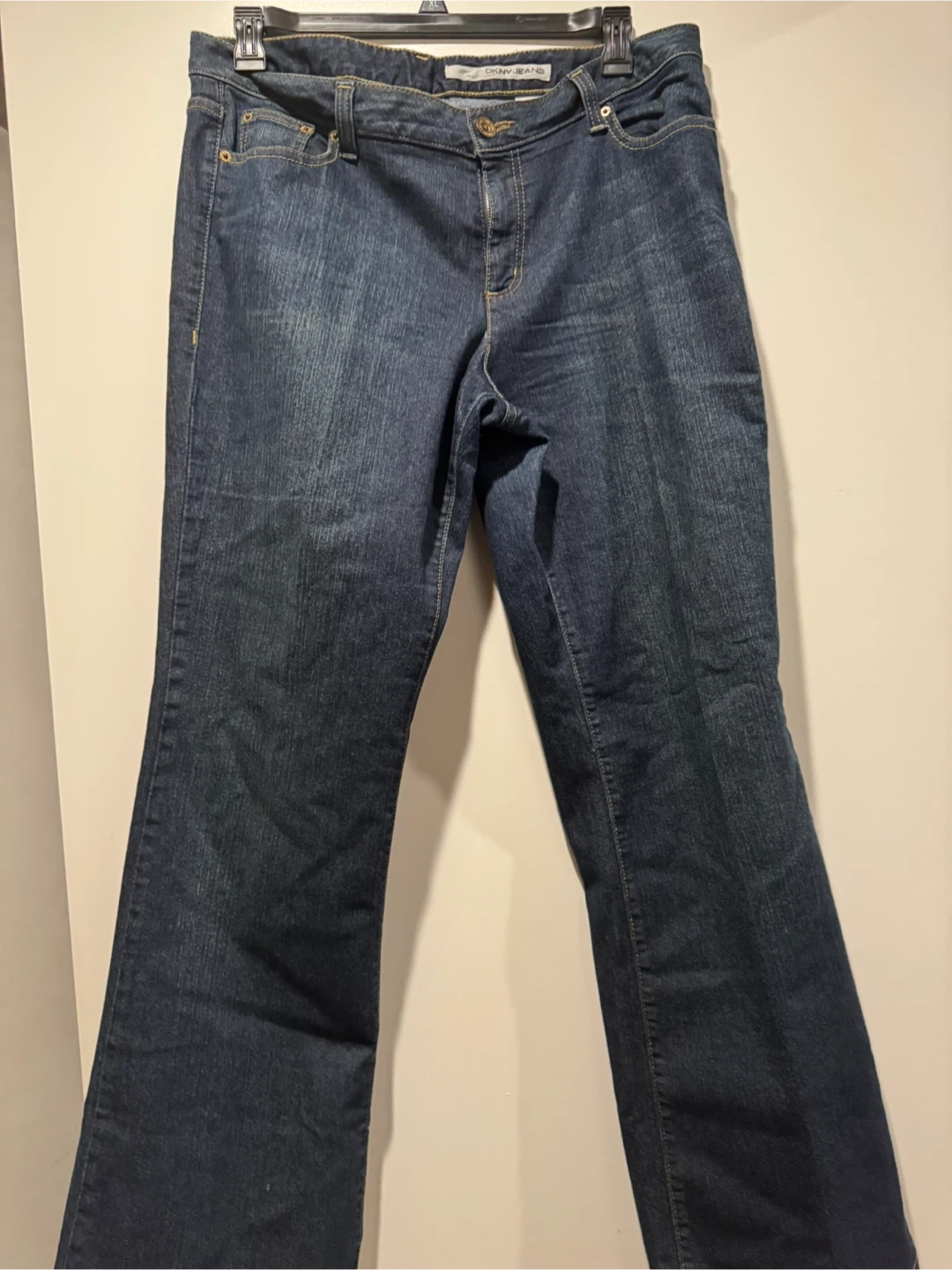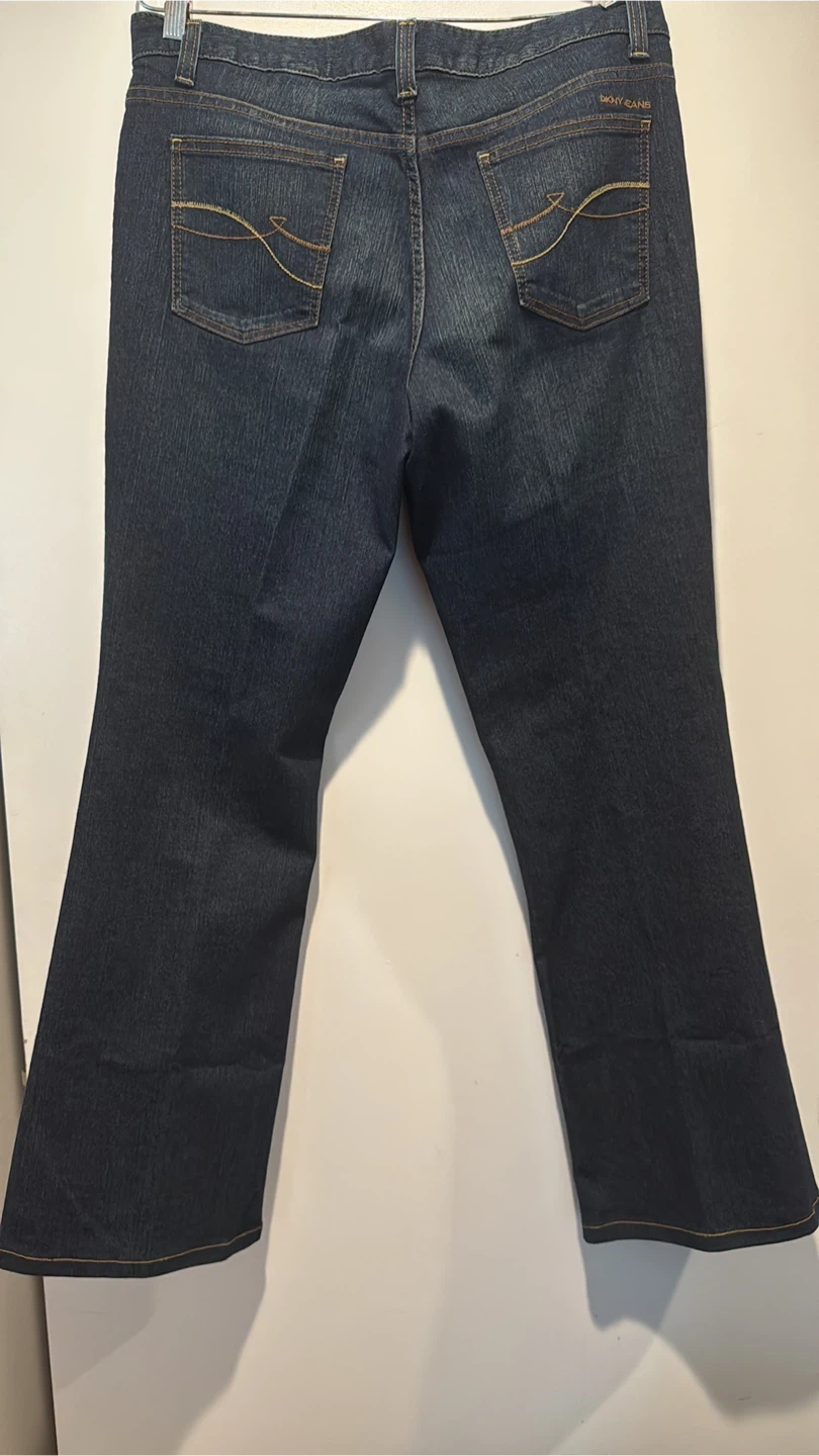 DKNY Jeans women's bootcut jeans in a classic blue denim. The size is 16. These jeans have a traditional five-pocket design with signature stitching on the back pockets. They're made from a durable denim blend.