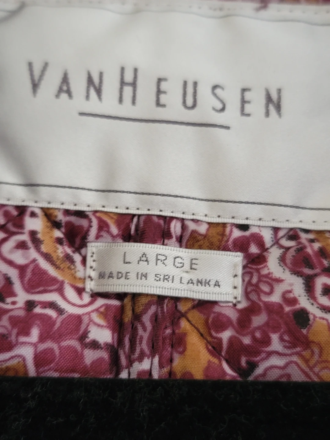 A plum-colored quilted jacket by Van Heusen. It's a size Large with a floral patterned lining.