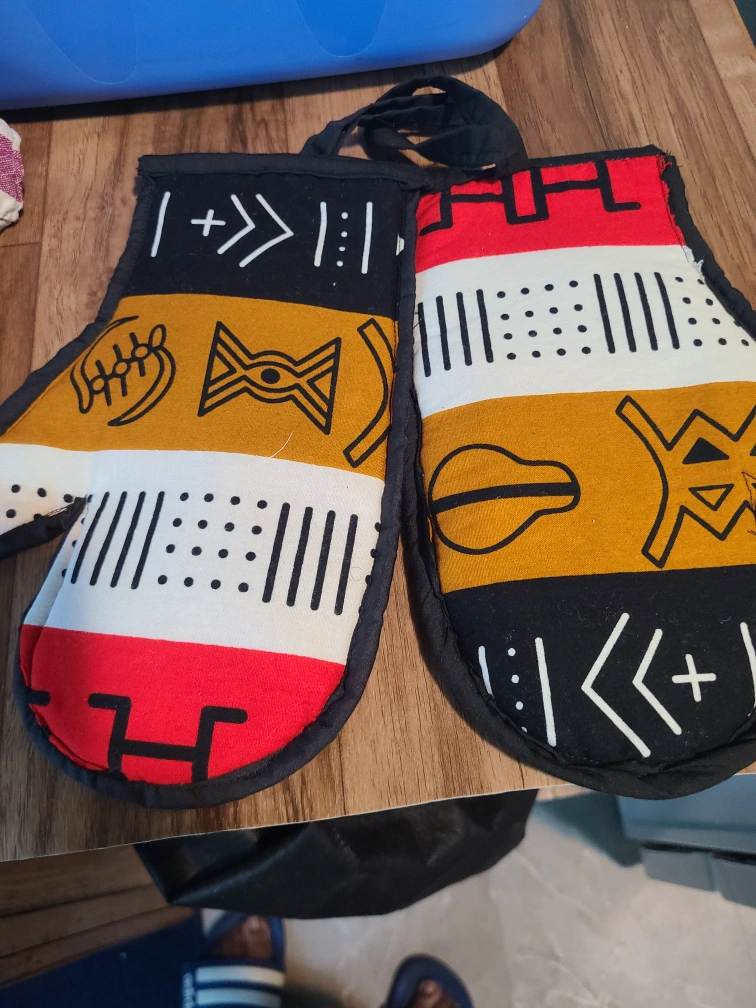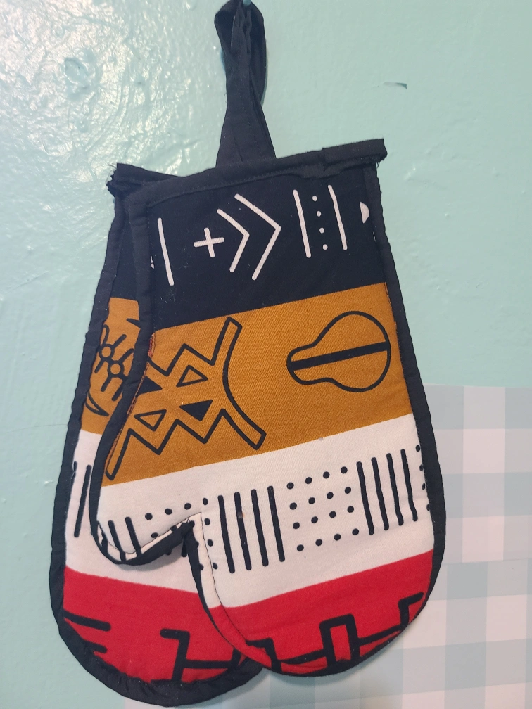 I'm selling a set of two handmade oven mitts! They feature a unique design with black, white, red, and gold colors. Perfect for adding a touch of style to your kitchen!