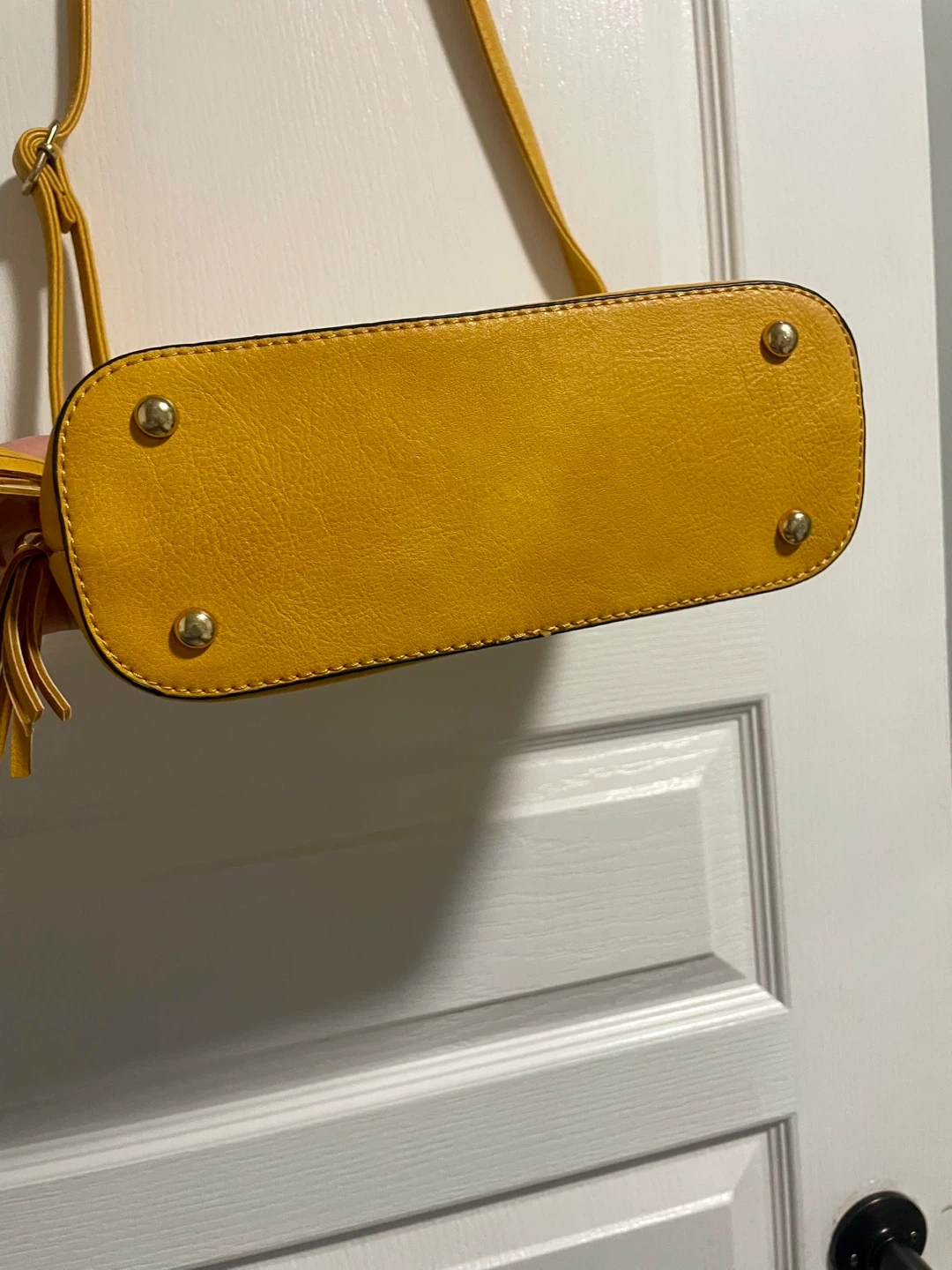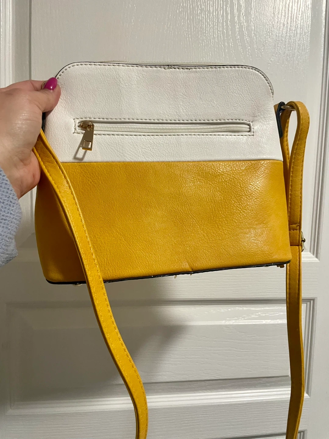This is a stylish women's crossbody bag with a two-tone design in white and mustard yellow. It features a main zippered compartment and an external zippered pocket on the back. The bag also has decorative tassels and a long adjustable strap. It's perfect for everyday use!
