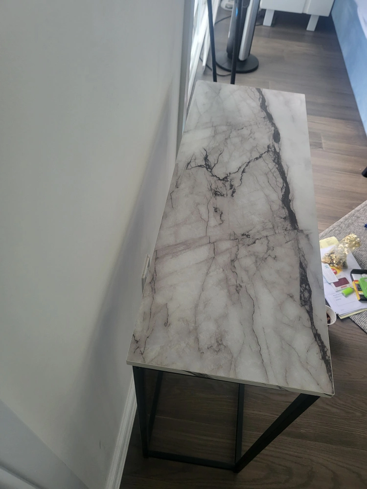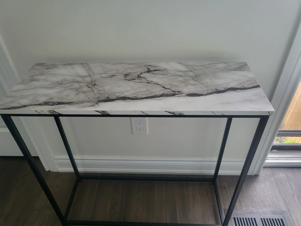 Here's a console table with a marble-patterned top and a black metal frame. It's in great shape and would look lovely in an entryway or hallway!