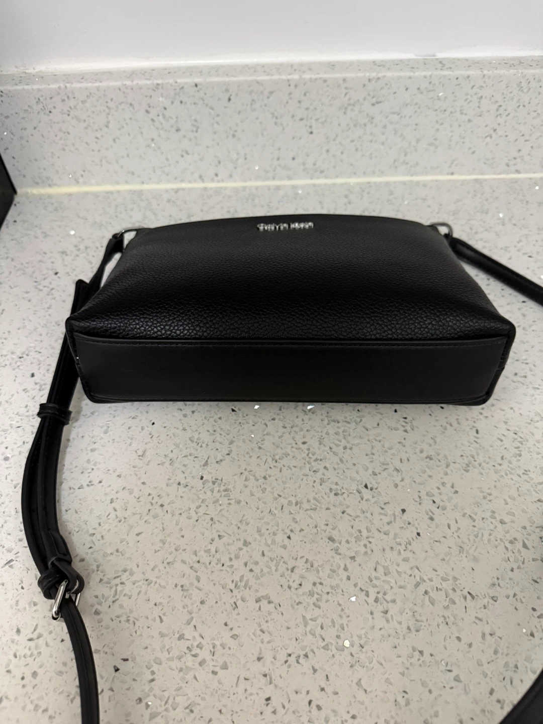 This Calvin Klein crossbody bag is made from black faux leather. It features a zip closure and an adjustable shoulder strap. Perfect for everyday use!