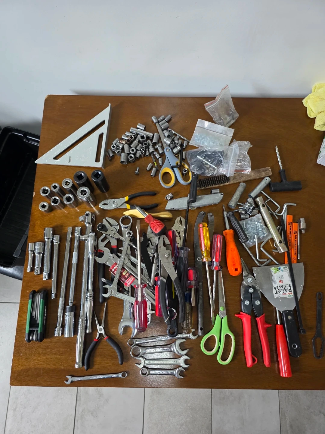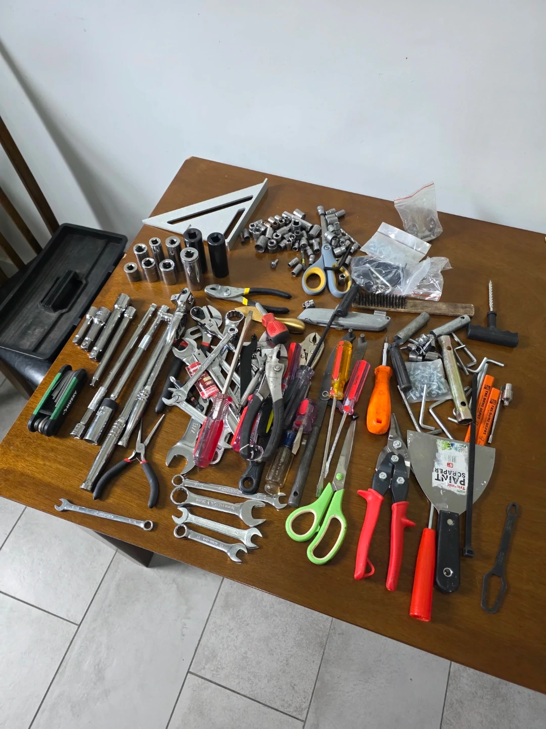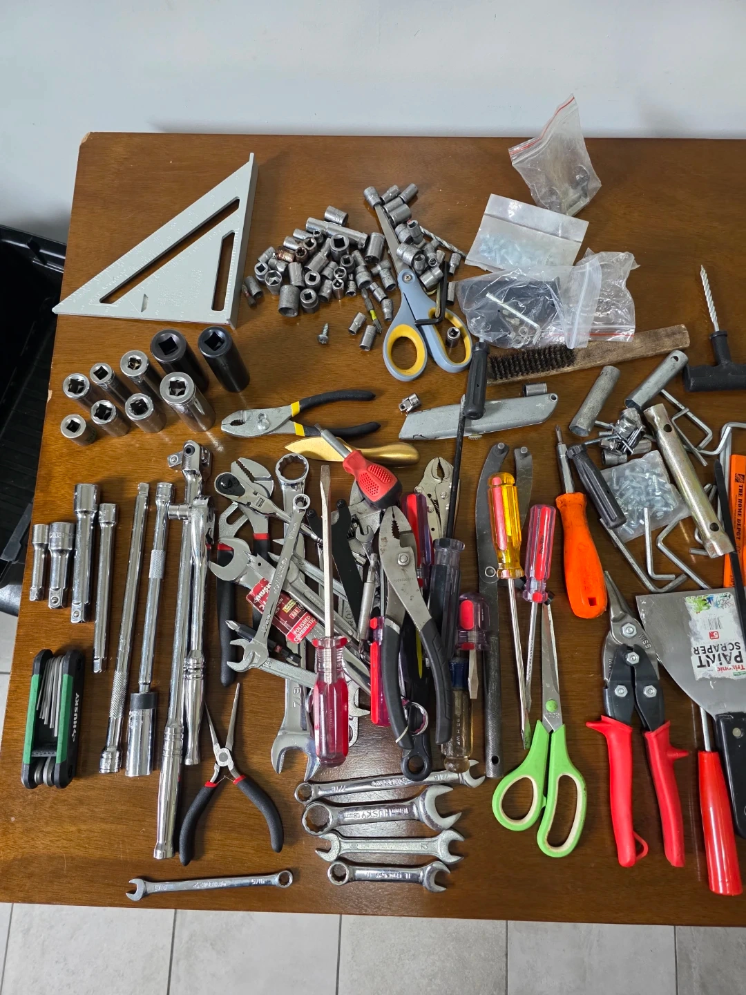 This is a large collection of assorted hand tools. It includes various wrenches, sockets, pliers, screwdrivers, a scraper, and a measuring square. Tools appear to be in good condition.Hello, due to travel I'm selling my tools. If anyone is interested, I'm asking $200 for everything, including the box.