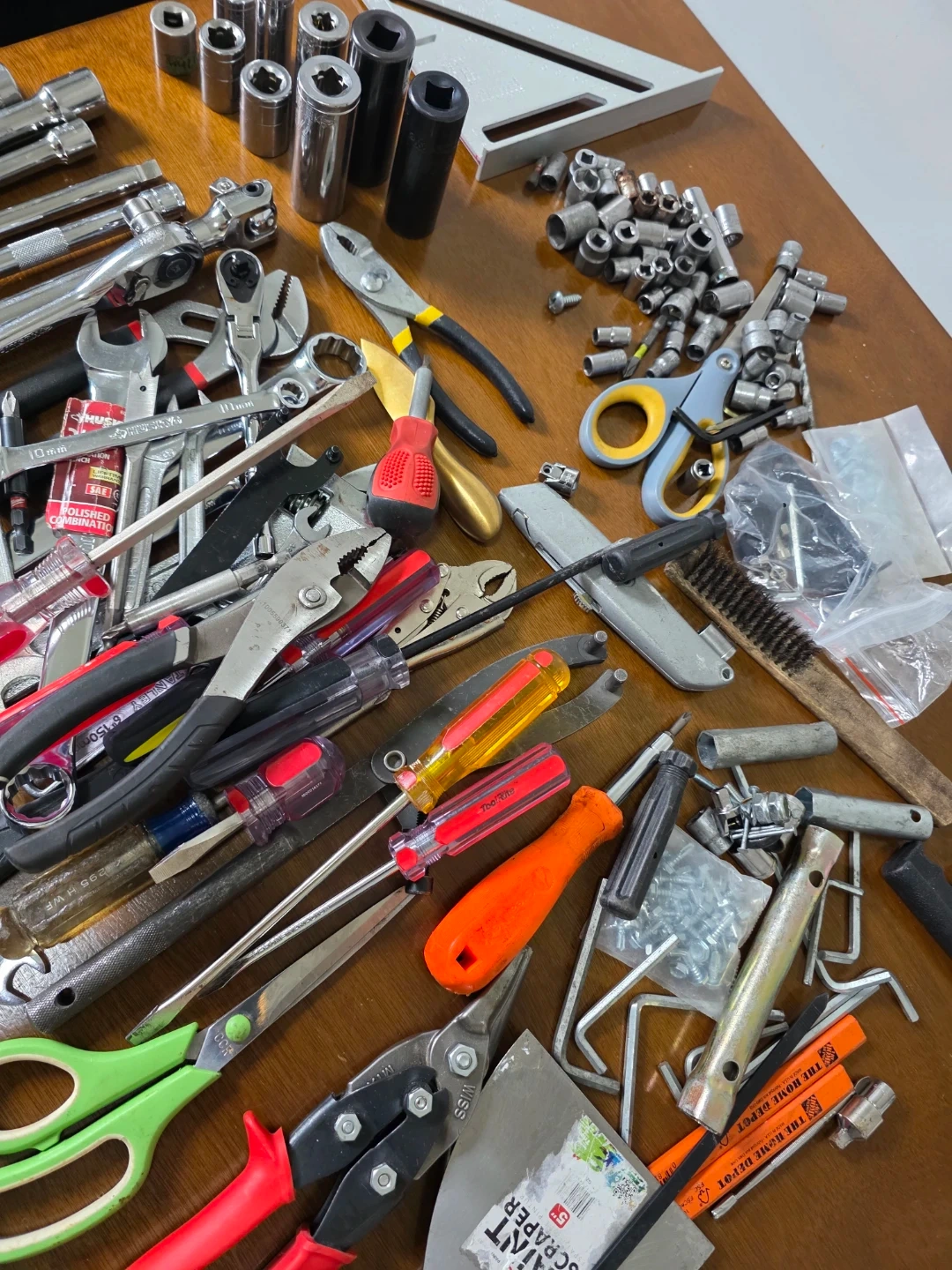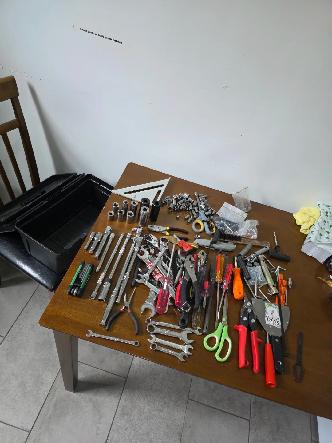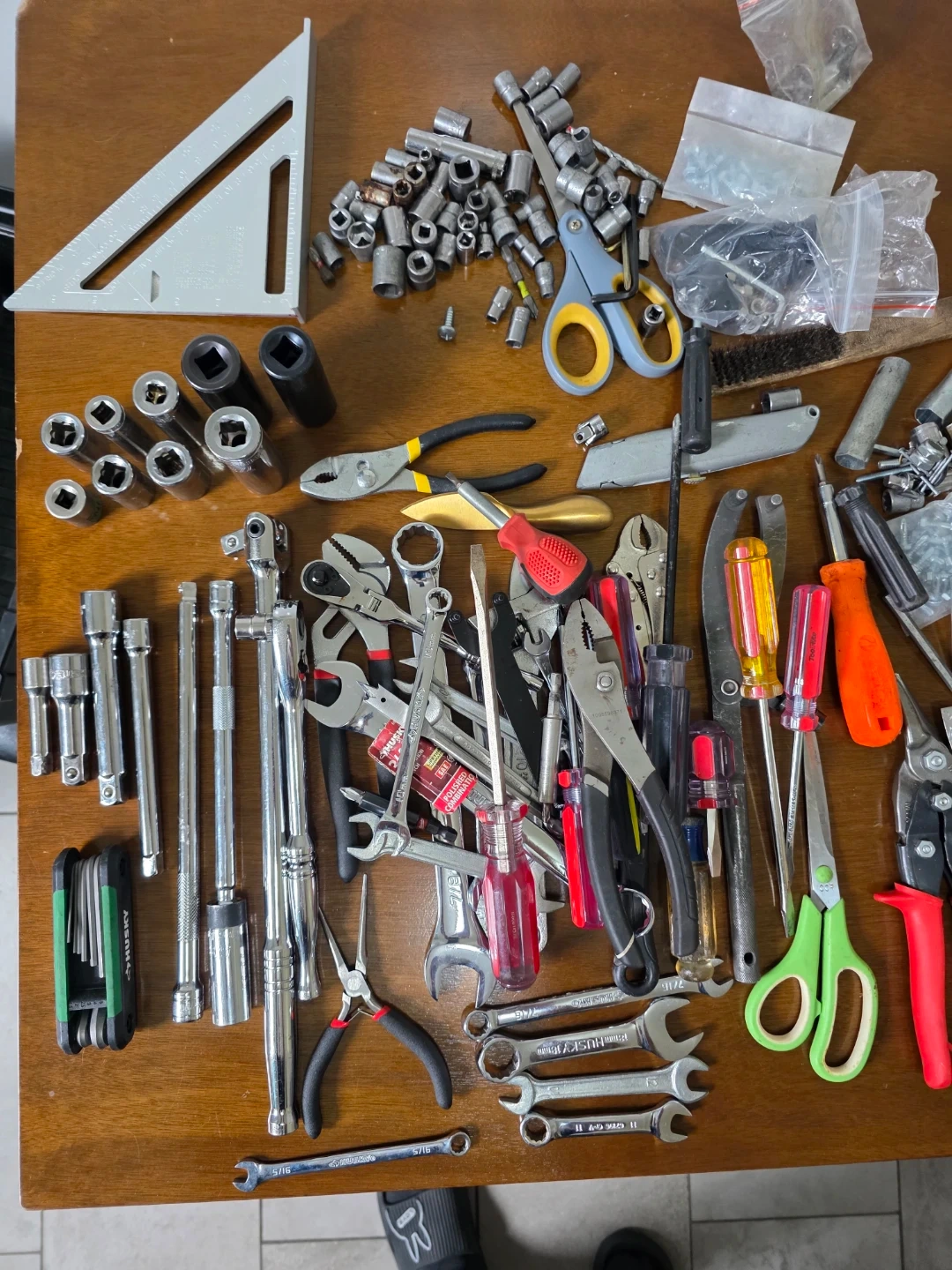 This is a large collection of assorted hand tools. It includes various wrenches, sockets, pliers, screwdrivers, a scraper, and a measuring square. Tools appear to be in good condition.Hello, due to travel I'm selling my tools. If anyone is interested, I'm asking $200 for everything, including the box.