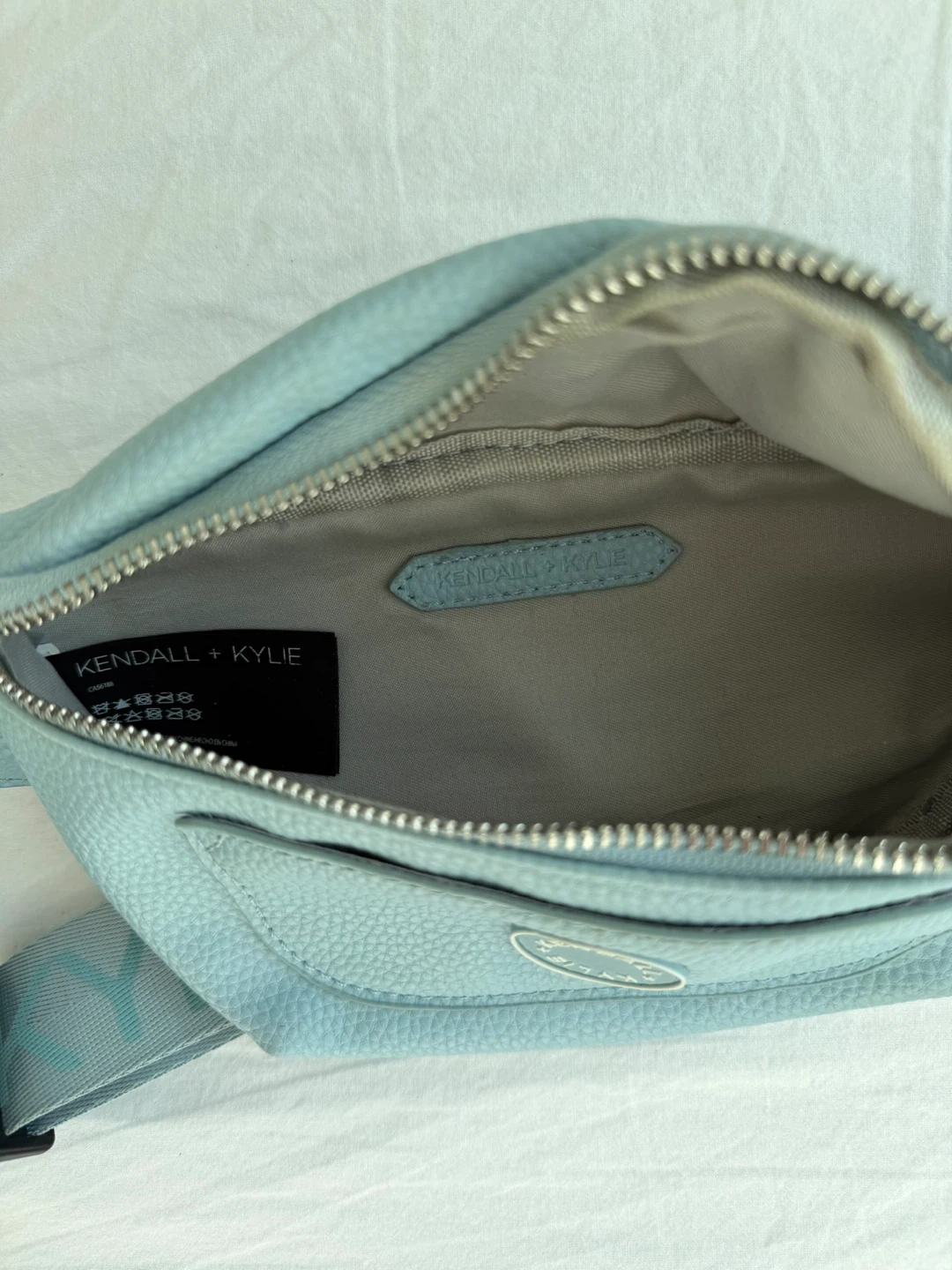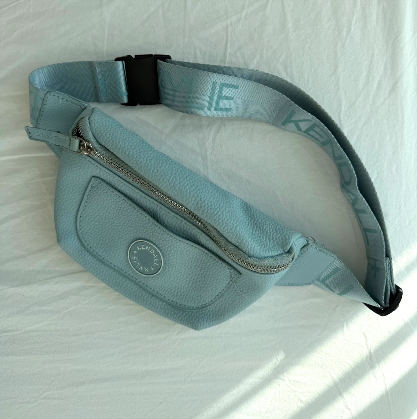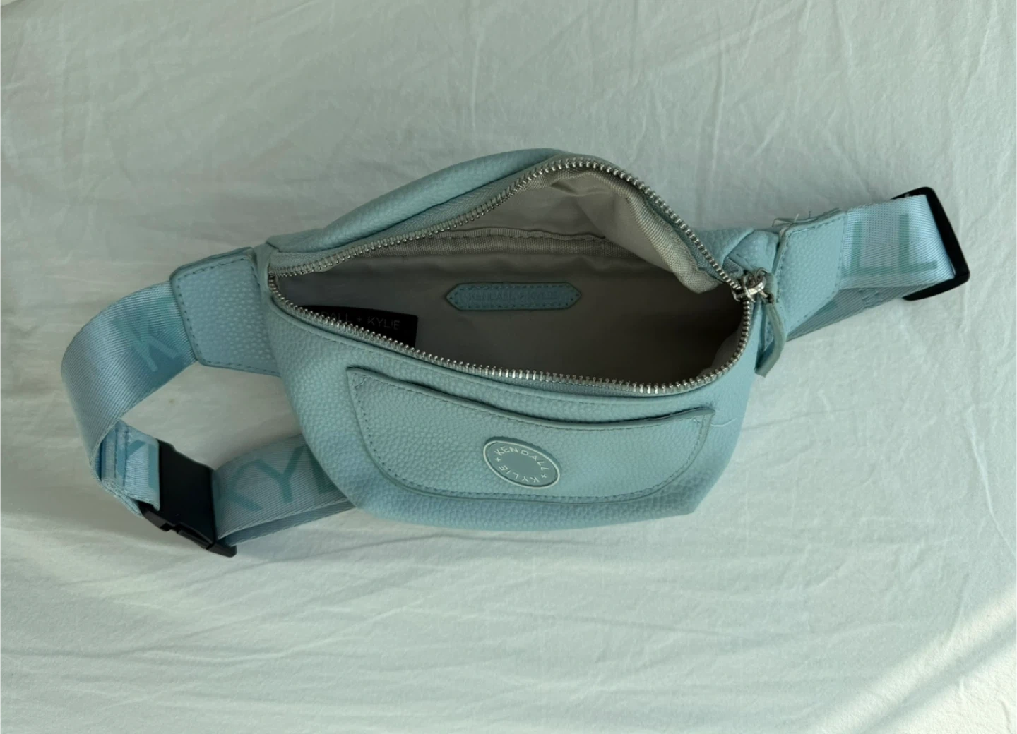 This Kendall + Kylie belt bag is made from light blue faux leather. It features a zip closure and an adjustable strap with the brand name printed on it. A great bag for hands-free convenience!
