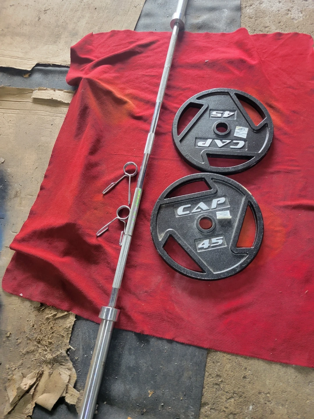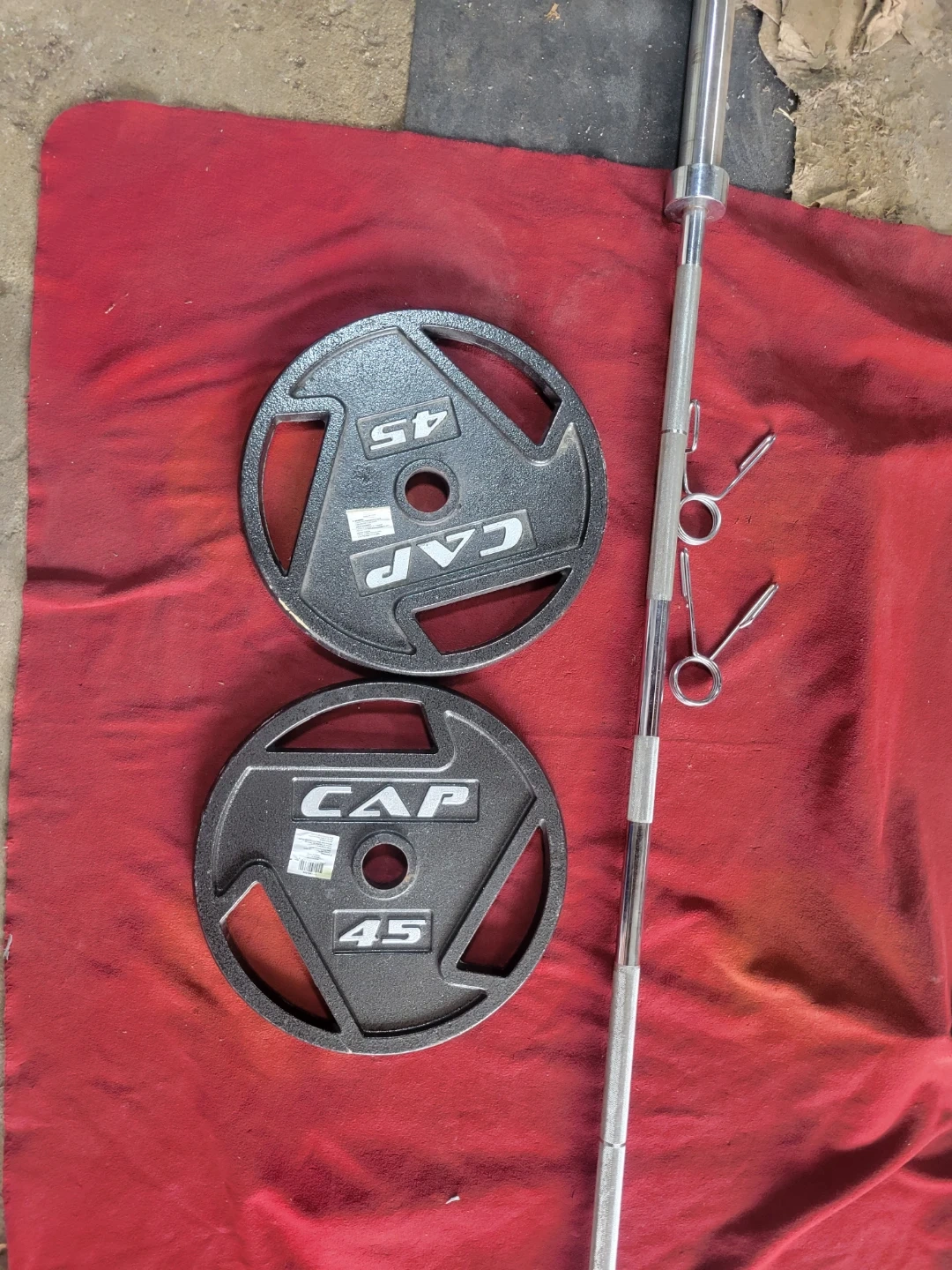 CAP. SET OF 45s. TOTAL 90LBs. WITH 7' OLYMPIC BAR 45LBs