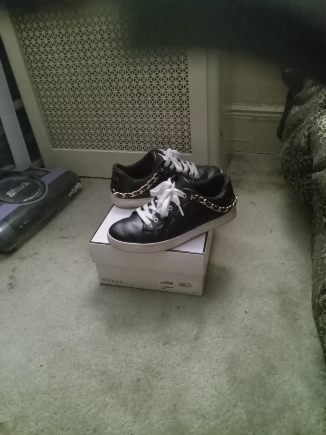 Guess black leather sneakers with a decorative gold chain accent. These come with white laces and are in their original Guess box. They feature a classic low-top design.