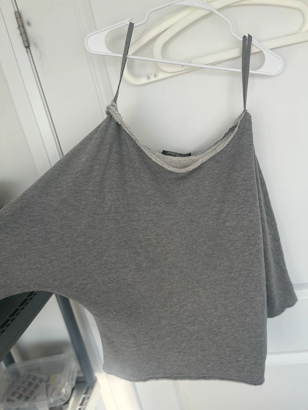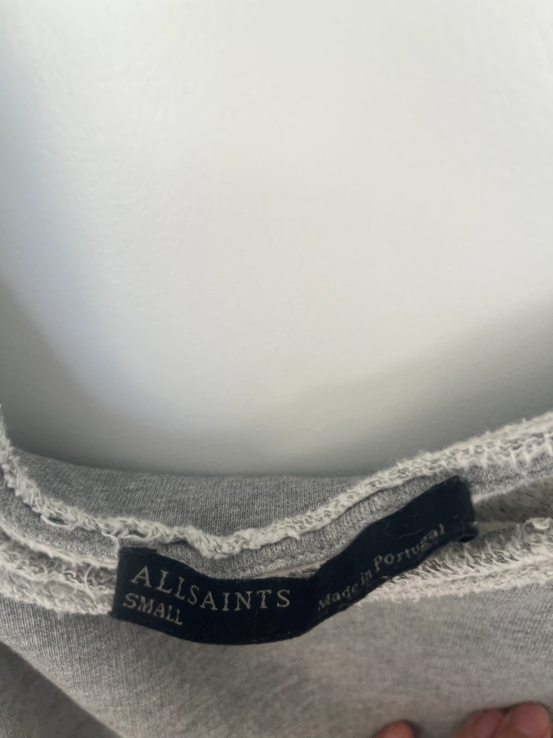 Grey AllSaints top in a small size. It's made in Portugal with a soft jersey material. The dolman sleeves offer a relaxed fit.