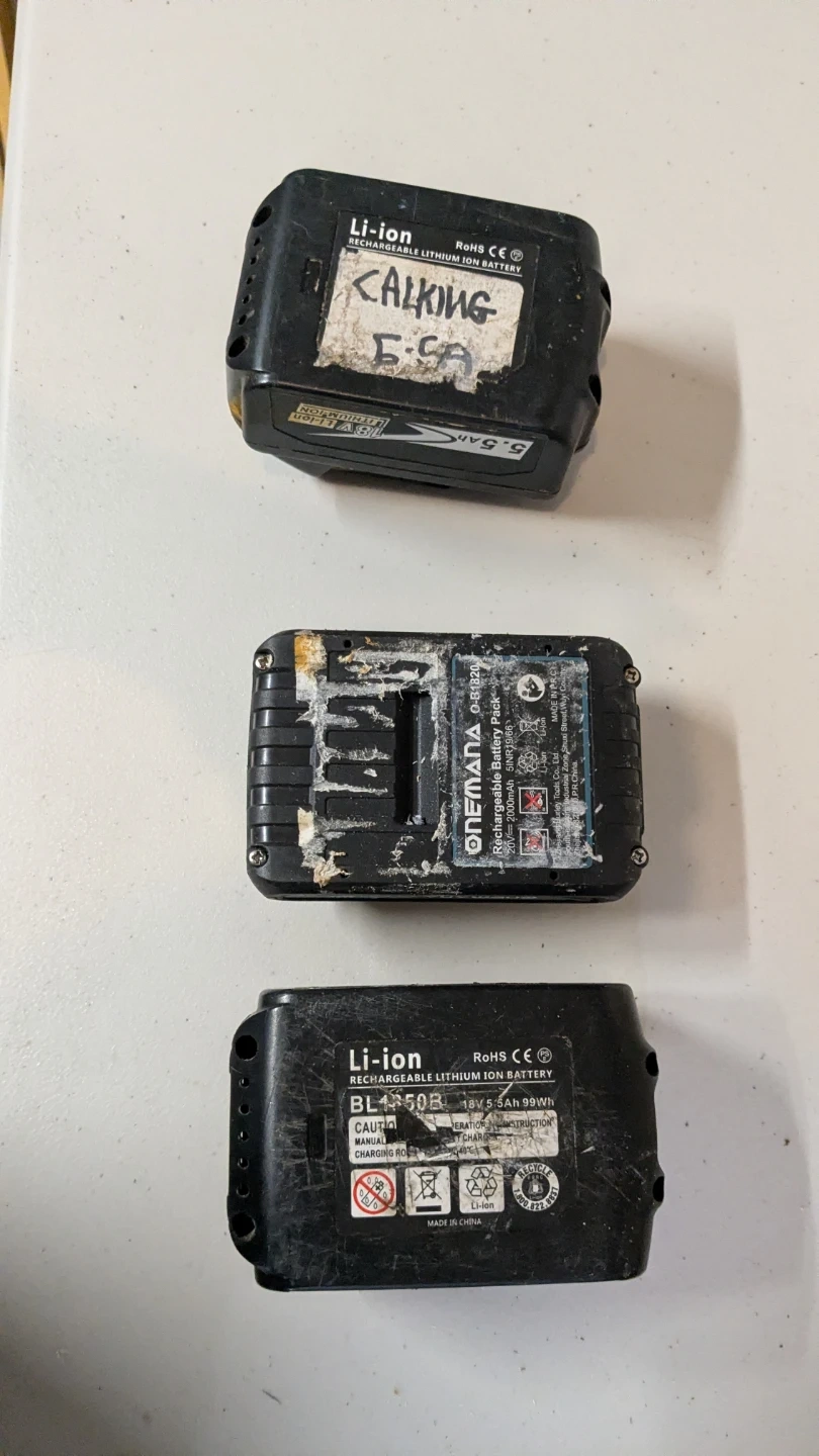 Two battery's are 5.5Ah, and the other one is 3.0Ah. The two 5.5s sat in water and need to be opened up and inspected and cleaned (Don't burn down your house because you need cheap batteries). The small battery isn't Makita brand doesn't fit on charger but does fit in a drill.