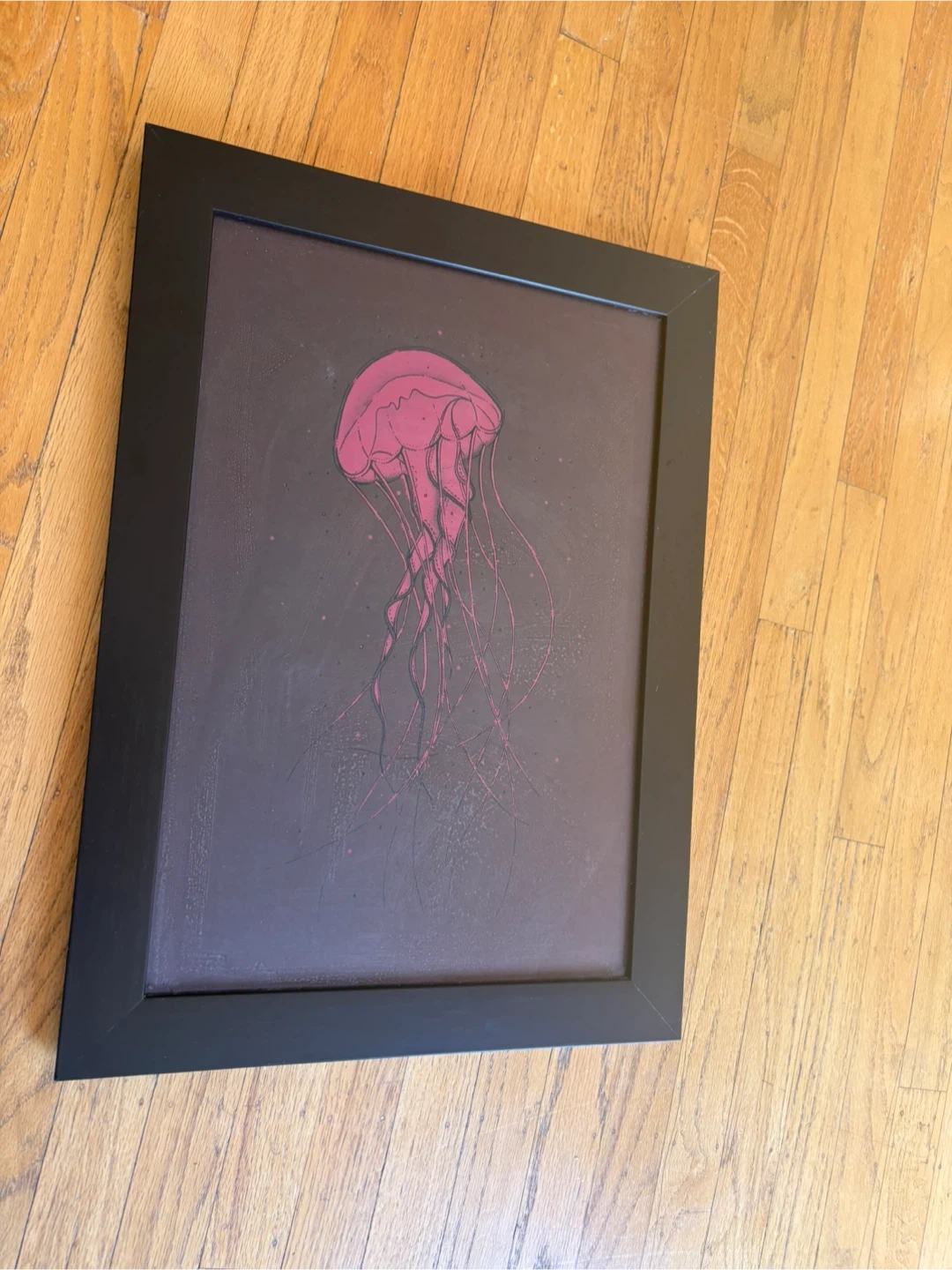 Framed art print featuring a pink jellyfish. Black frame included. This piece adds a touch of marine life to any room. Hardware on the back for easy installation.