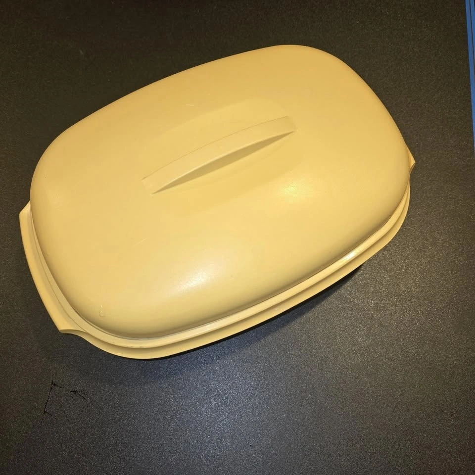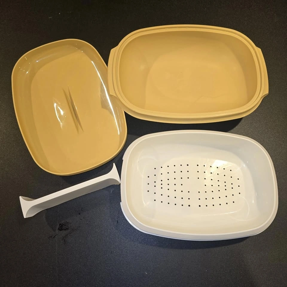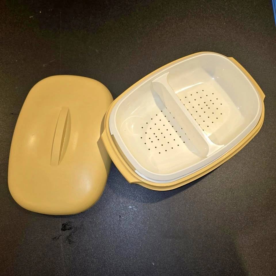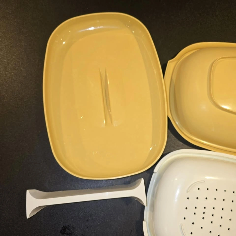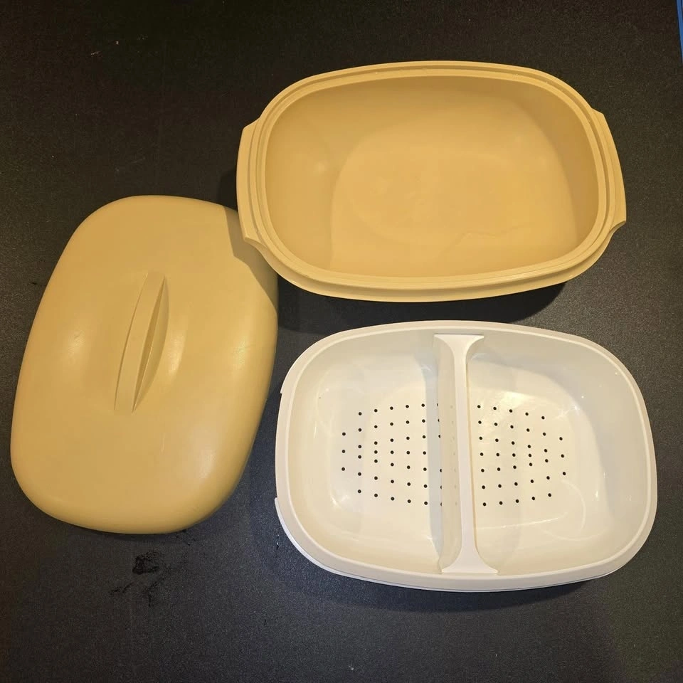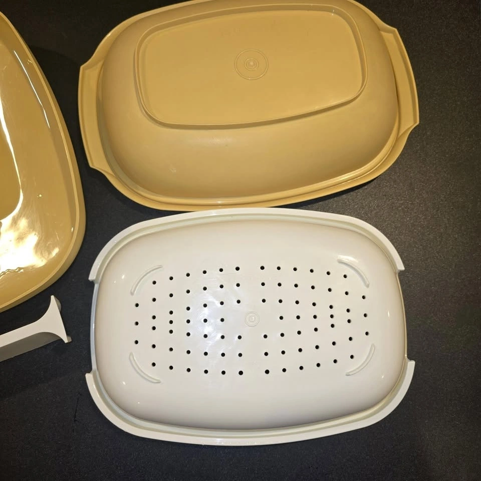 This vintage Tupperware #1273-5 Harvest Gold 4 Piece Vegetable Rice Steamer Strainer is a retro-style kitchen collectible from the 1970s. The set includes a top, steamer/strainer insert, and bottom compartment, all made of durable plastic in a solid gold color with a snap-on lid featuring a handle. The oval-shaped steamer has two tiers and is designed for easy cleaning, making it a practical and stylish addition to any kitchen storage and organization collection. Made in the United States by the original manufacturer Tupperware, this vegetable steamer is a unique and nostalgic piece for adult collectors.