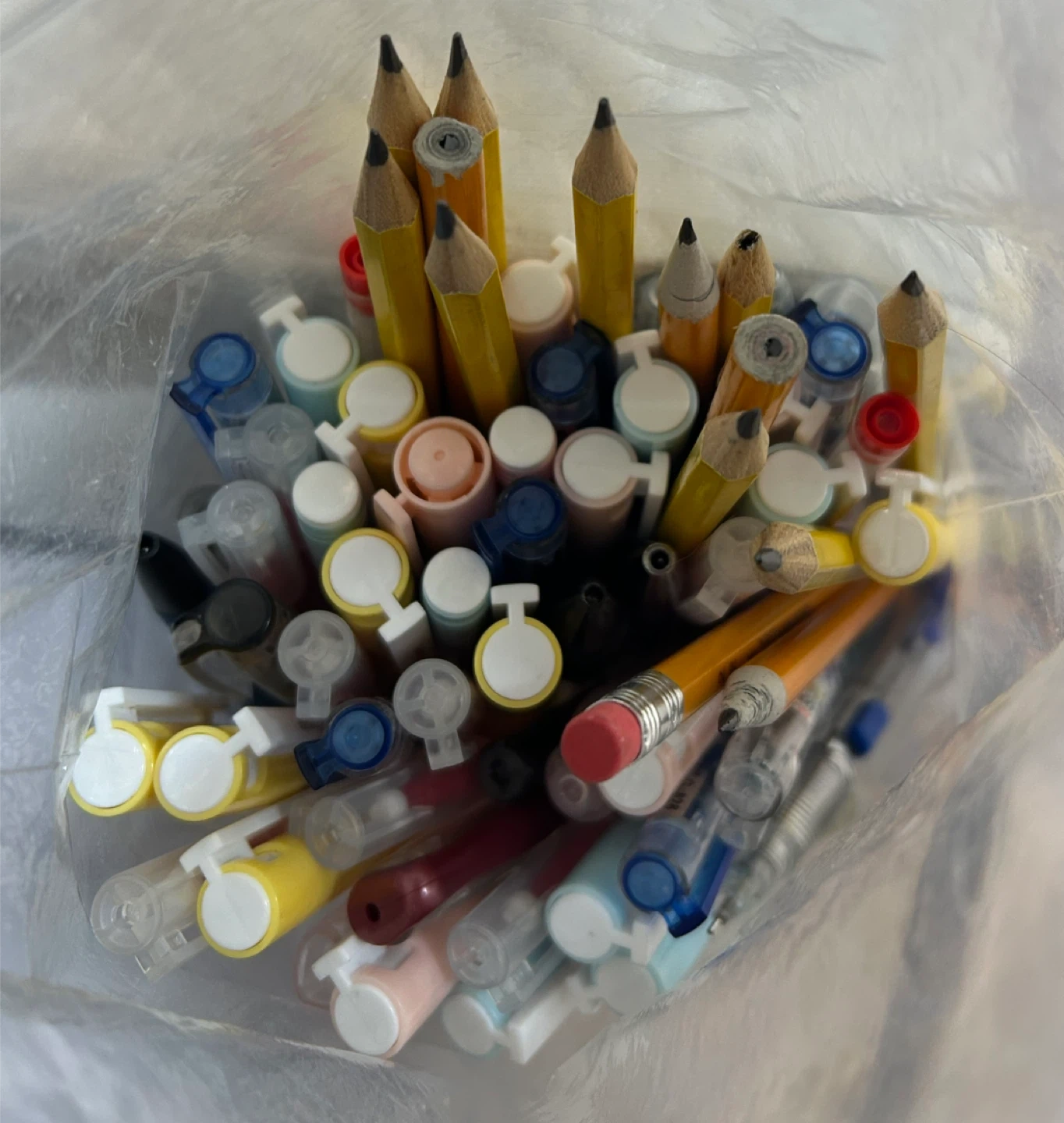 A collection of writing utensils, including pencils, markers and pens in various colours. It's a great mix for school or office use.