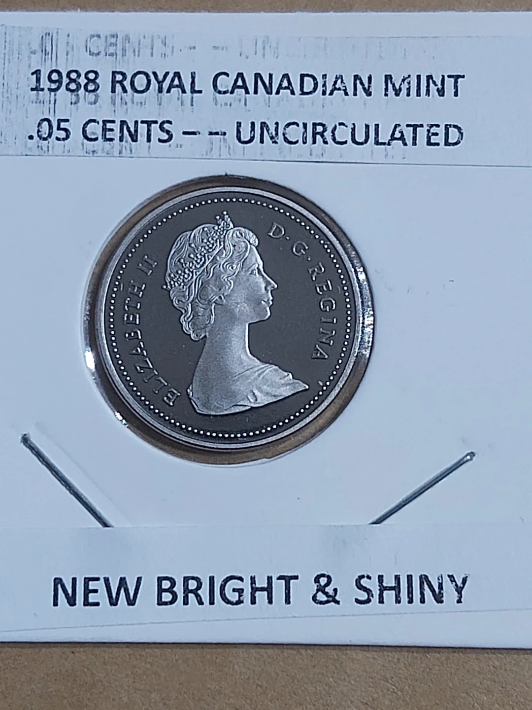 This is a 1988 Canadian 5 cents coin, uncirculated from the Royal Canadian Mint. It features the iconic beaver design on one side and Queen Elizabeth II on the other. It's bright and shiny, perfect for collectors!