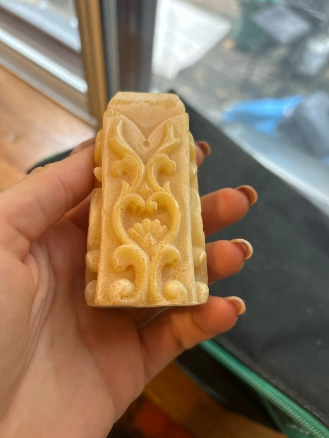 This beautifully carved candle has timeless charm — a delicate floral scroll motif reminiscent of vintage plaster moldings or cathedral columns. The candle appears to be hand-poured beeswax (warm honey-amber tone, light natural scent) and is solid with intricate relief details on all sides.