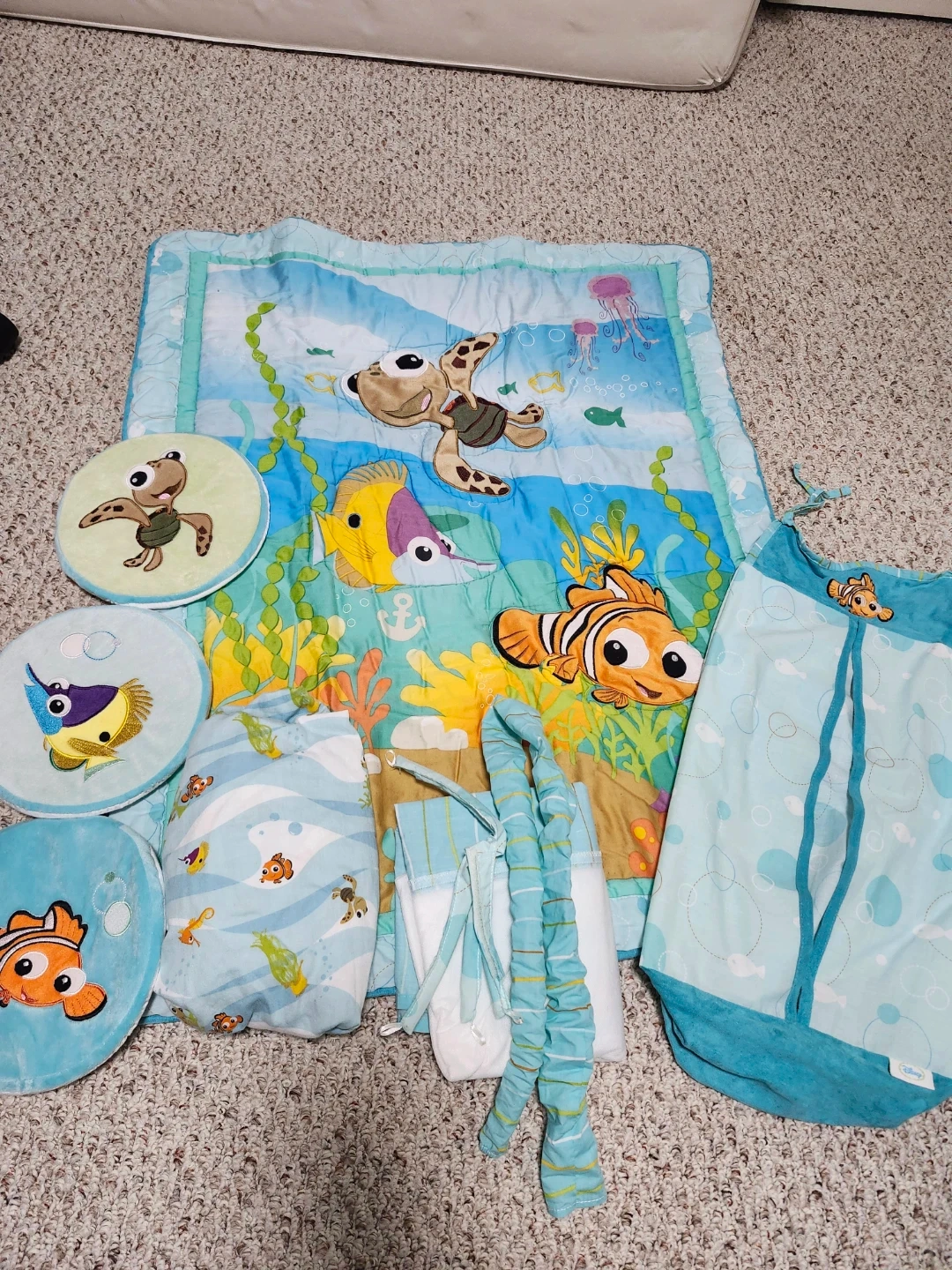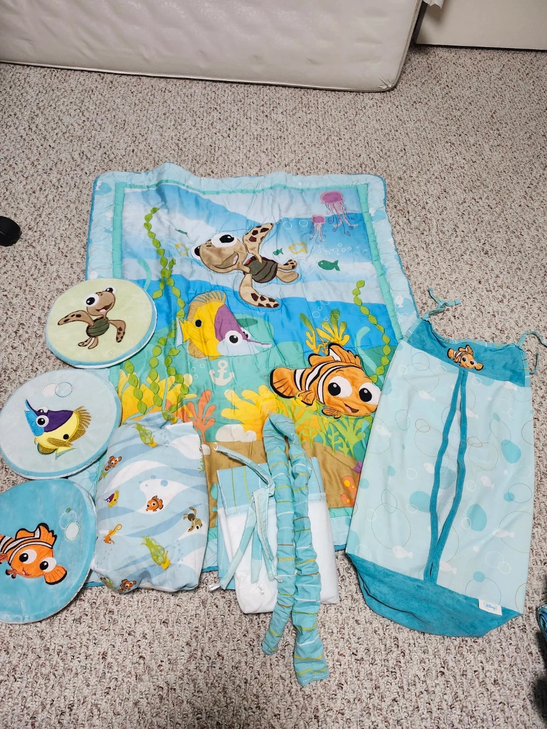 This set includes a quilt, skirt, fitted crib sheet, diaper stacker & 3 round wall soft canvases. The quilt measures 35" x 45". The skirt fits a standard crib mattress (28" x 52") with a 14-inch drop. The fitted crib sheet fits a standard crib mattress (28" x 52") with 8-inch deep pockets and is fully elasticized. Pick up in Oshawa (Harmony & Rossland). Cash only.