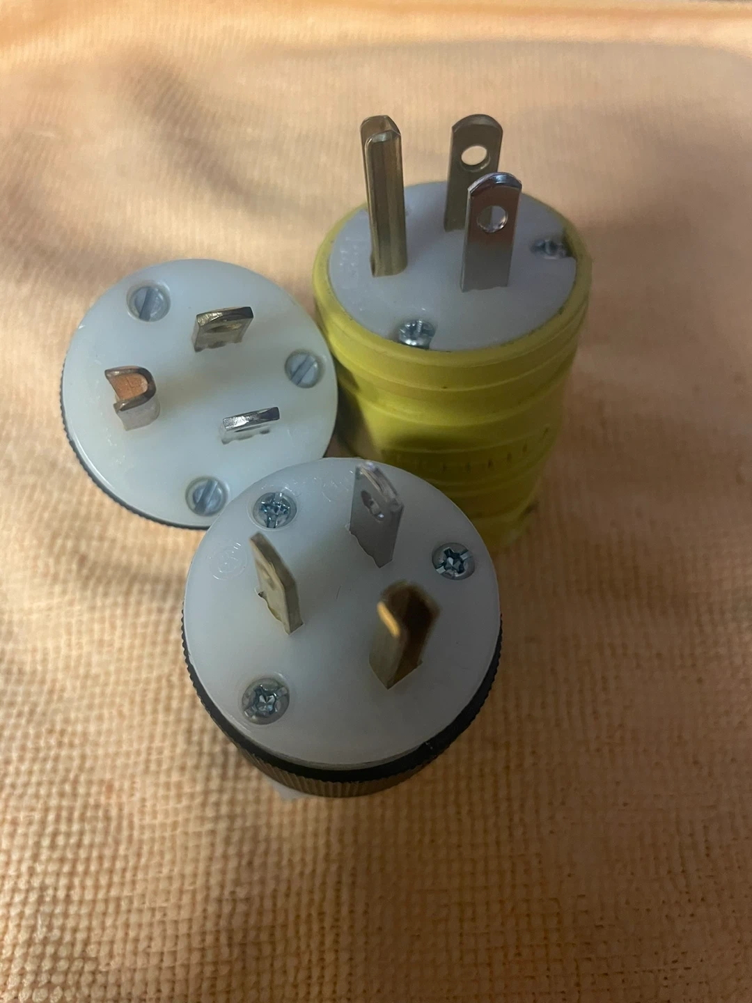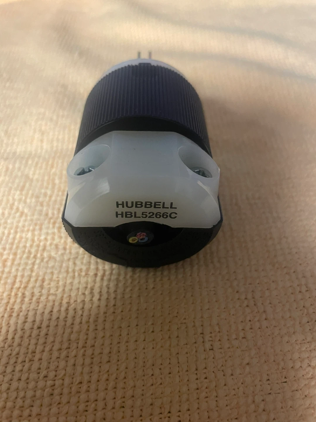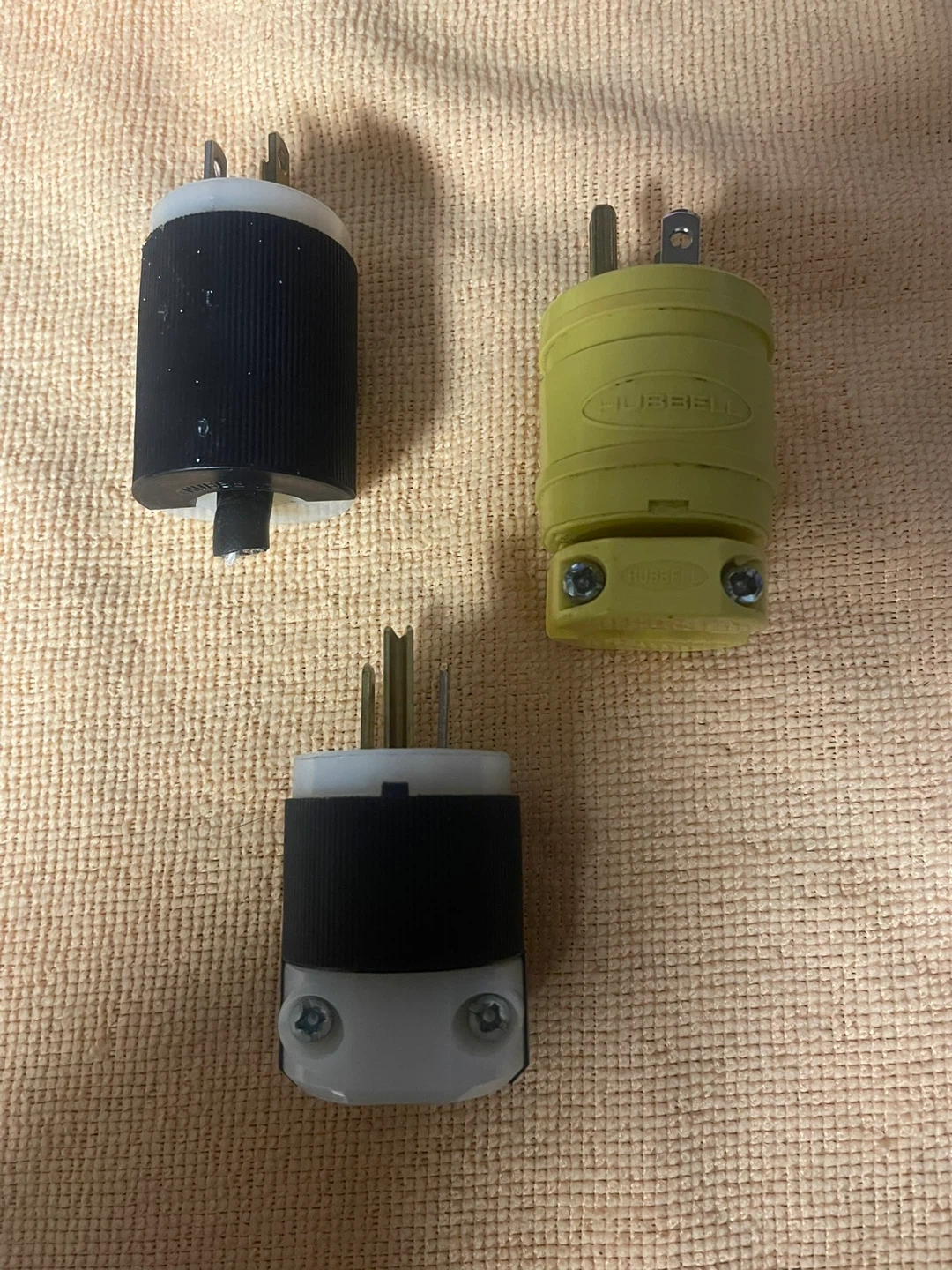Three electrical connectors are included: one Hubbell HBL5266C locking plug and two assorted receptacles. They are made of durable materials for reliable power connections. These connectors are suitable for various electrical applications.