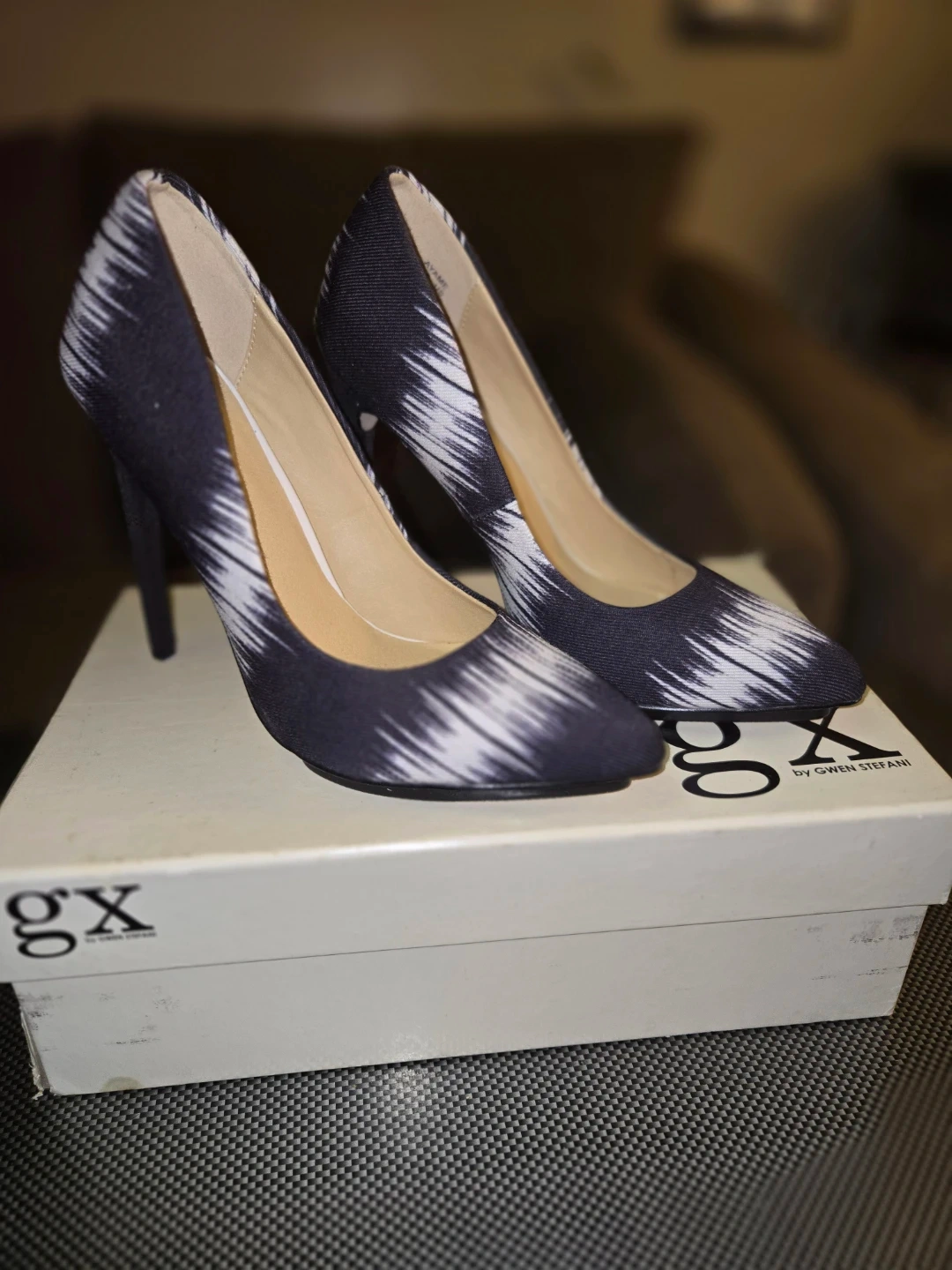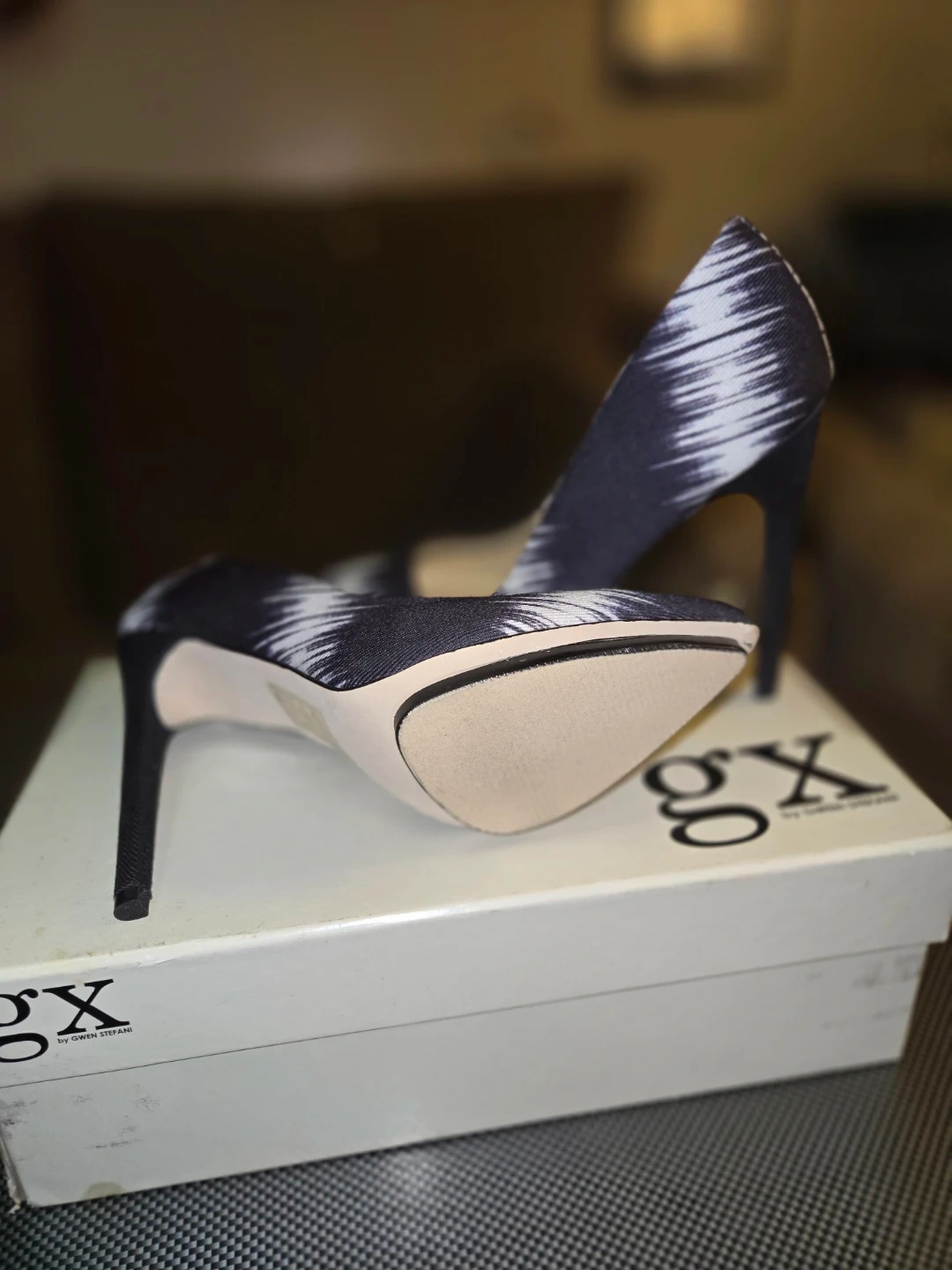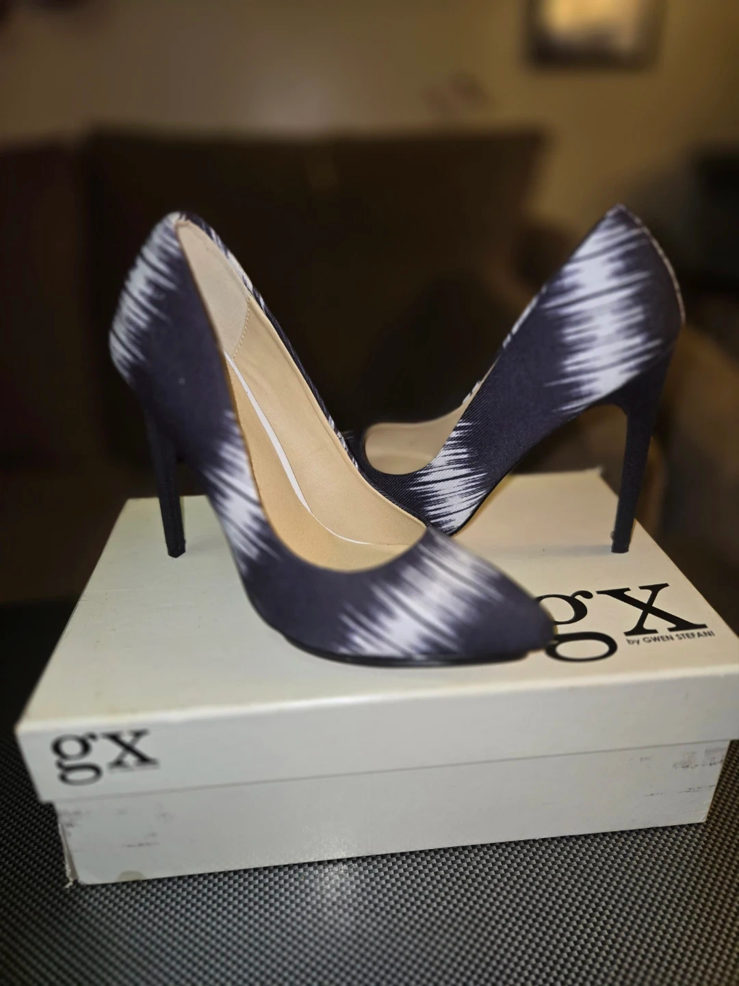 GX by Gwen Stefani women's heels with a striking black and white abstract pattern. These pumps feature a pointed toe and a stiletto heel, perfect for adding a bold touch to any outfit. Comes with original box.