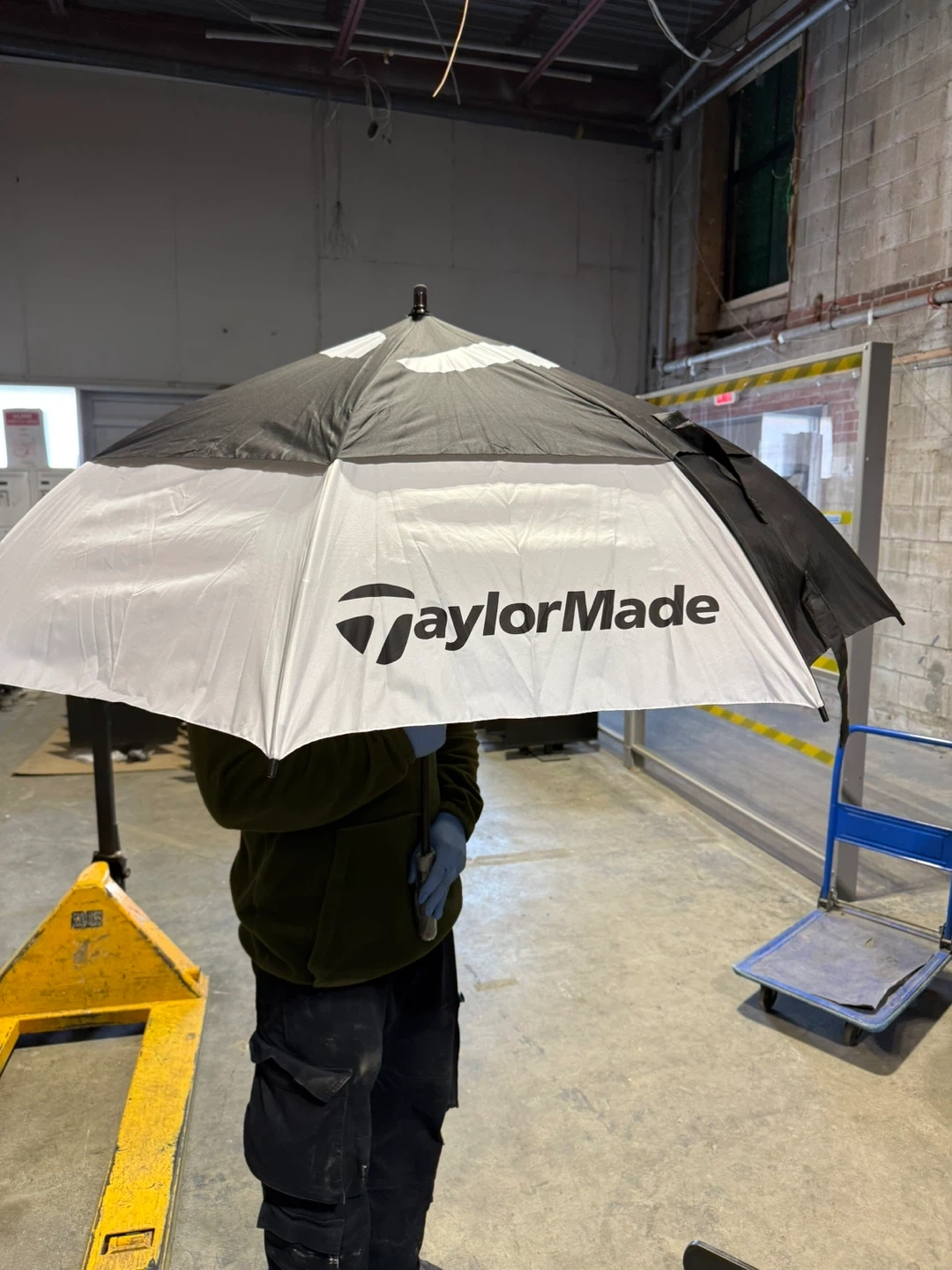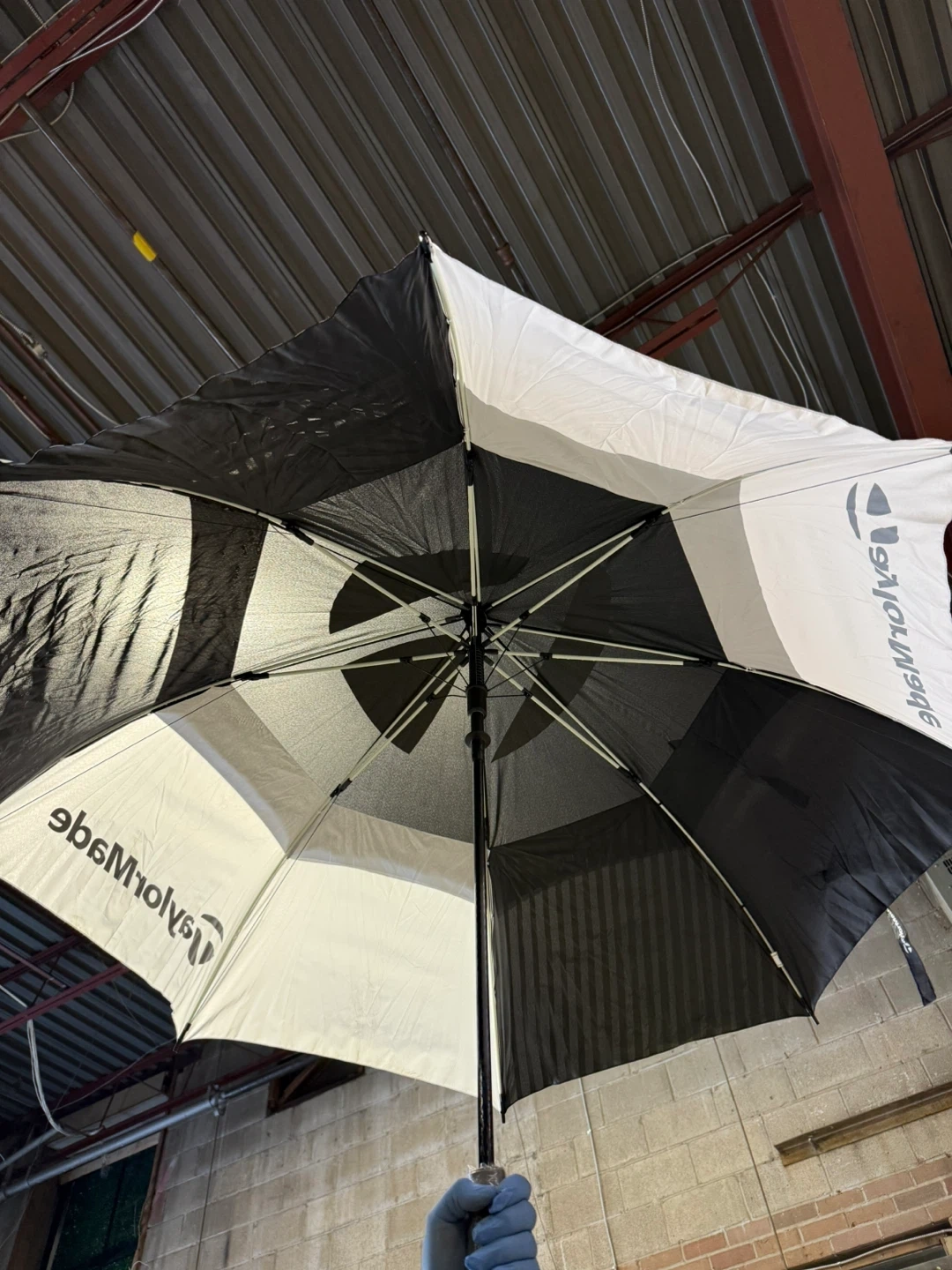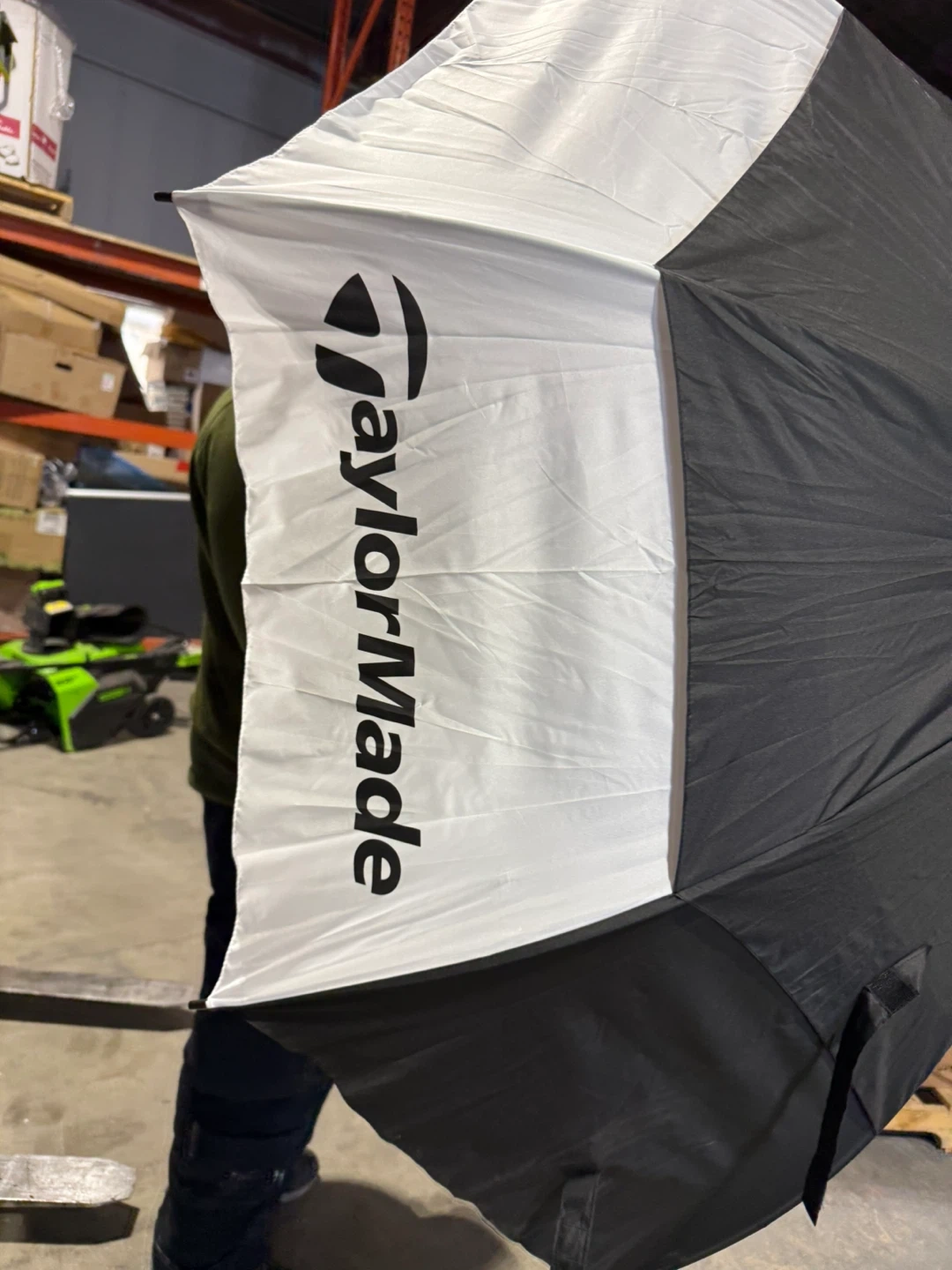 This is a large TaylorMade golf umbrella. It's black and white with the TaylorMade logo visible. It's perfect for keeping you dry during your next round of golf