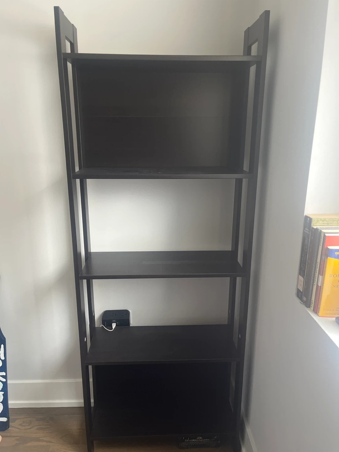 This is a dark brown ladder bookshelf with five shelves. It's made of wood and has led lights attached to it. Perfect for storing books or decorative items!