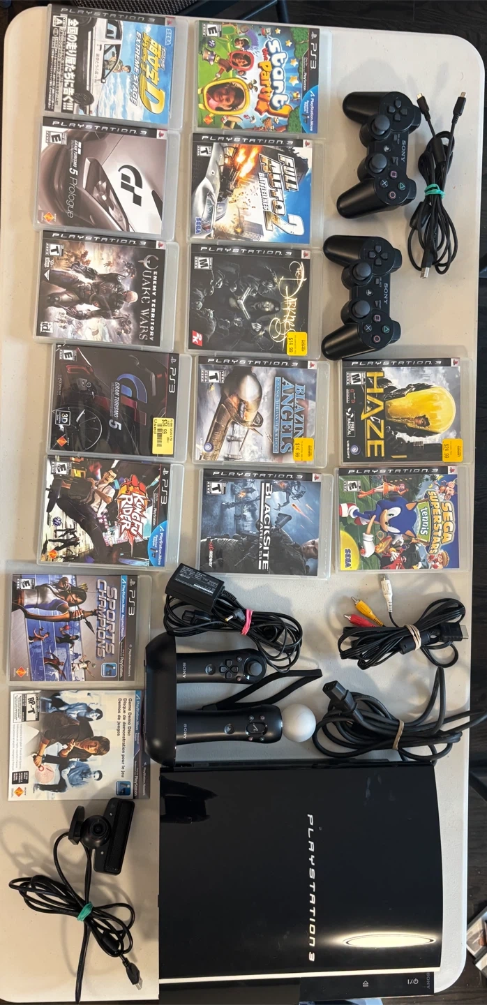 This bundle includes a black PlayStation 3 console, two wireless controllers, a PlayStation Eye camera, and several video games. Games include Gran Turismo 5, Full Auto 2, Blazing Angels, and more. Power and A/V cables are also included.