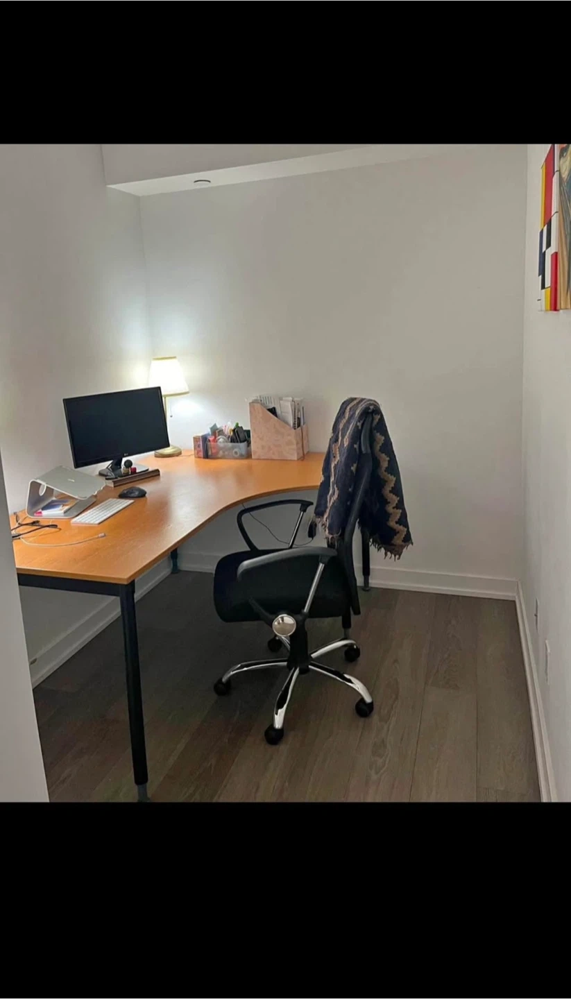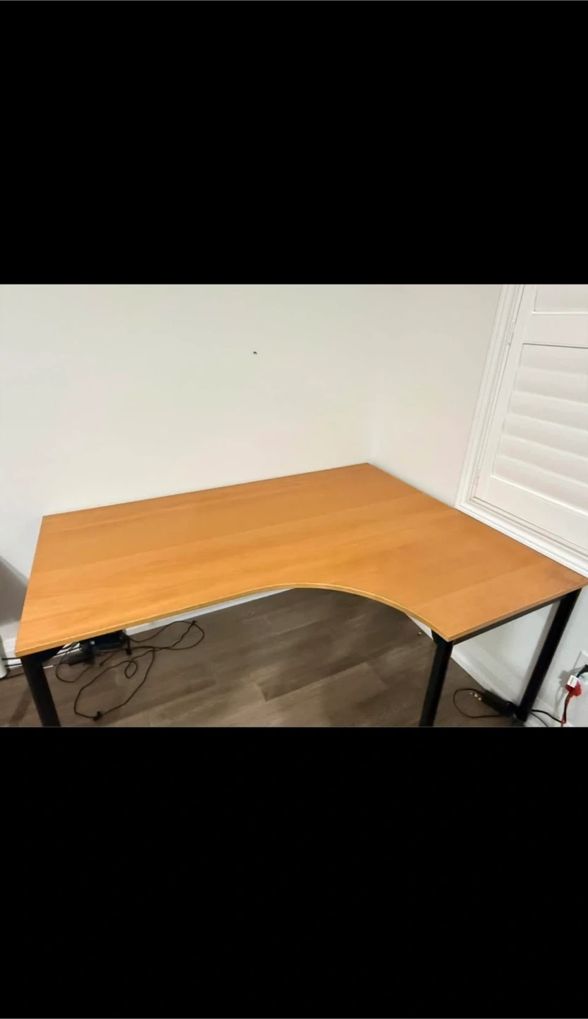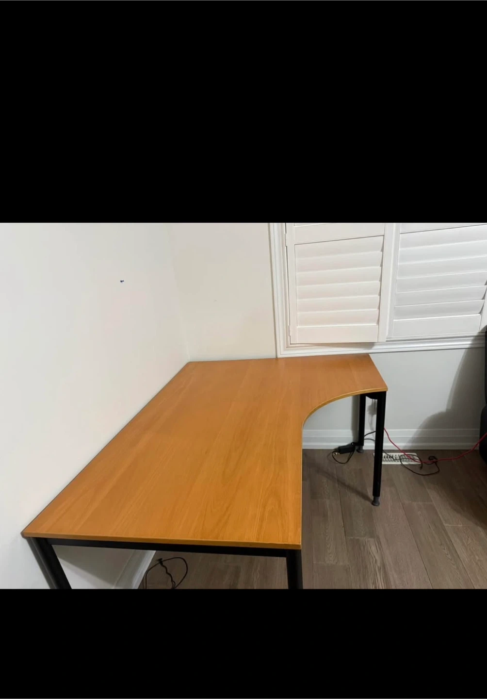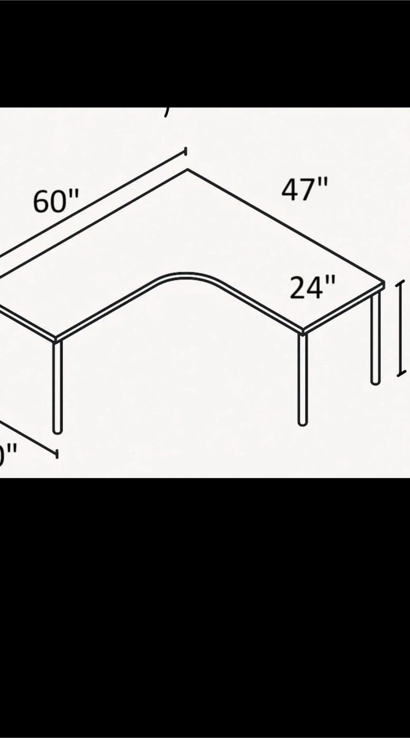 This L-shaped desk offers a spacious work surface with a cherry wood finish and black metal frame. It measures 60 inches on the long side and 47 inches on the short side, with a depth of 24 inches. It's a great desk for setting up a home office.