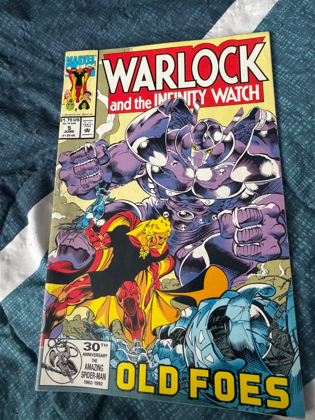 This is Marvel's Warlock and the Infinity Watch comic book, issue number 5. It features "Old Foes" and celebrates the 30th Anniversary of The Amazing Spider-Man (1962-1992). Printed in June.