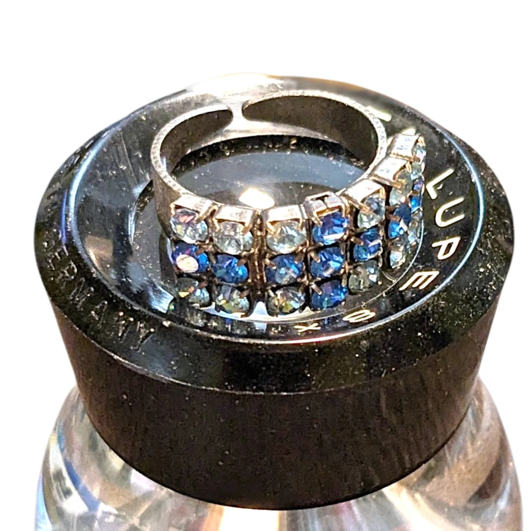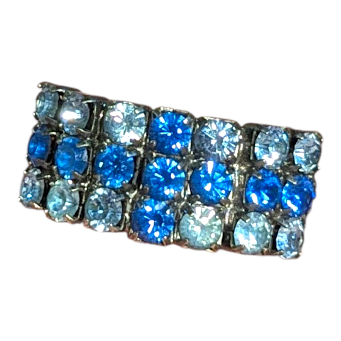 Gorgeous vintage blue rhinestone ring on silver tone adjustable band. Circa 1950s all stones are perfectly intact.