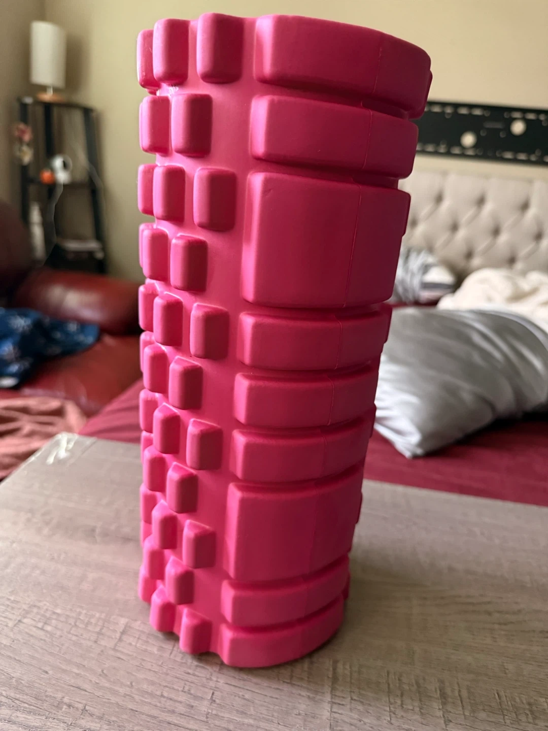 - This is a textured foam roller in a bright pink colour.