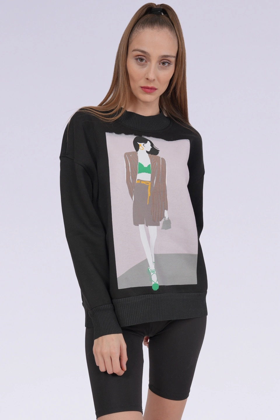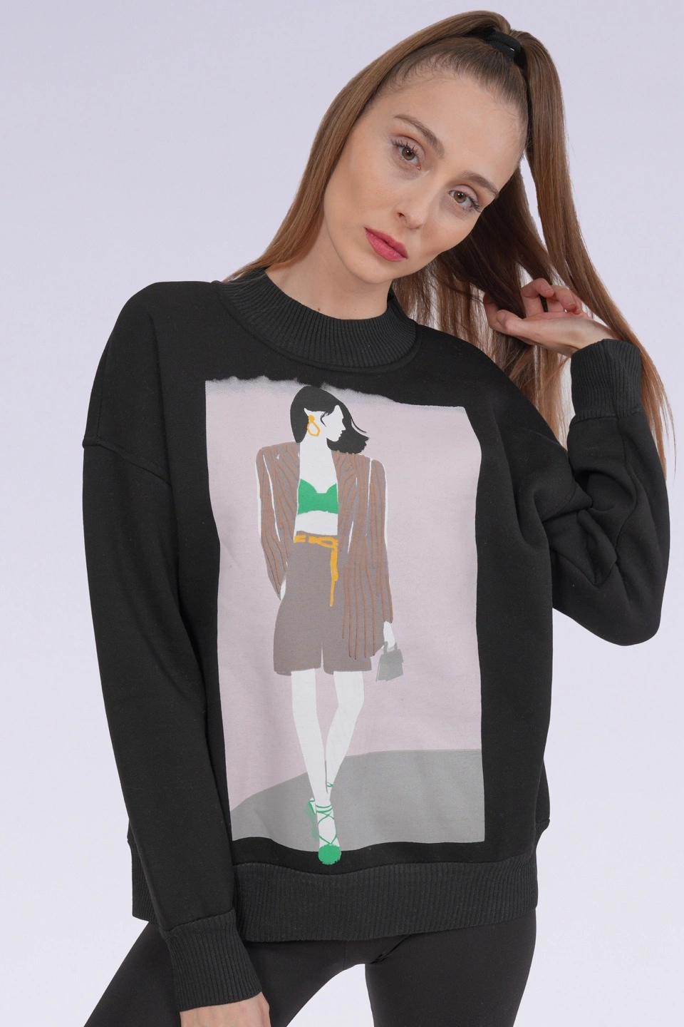 Brand new Comfy black sweatshirt featuring a stylish graphic print of a woman in a blazer and shorts. It's made from a soft material, perfect for casual wear. This crewneck sweater has a relaxed fit.