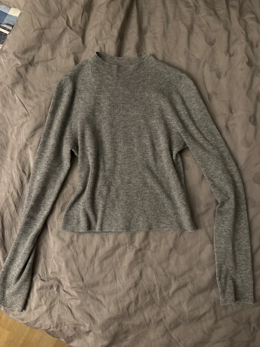 Comfy grey ribbed top with a mock neckline. Long sleeves and a cropped fit. Made from a soft knit material. Very soft and stretchy cashmere blend