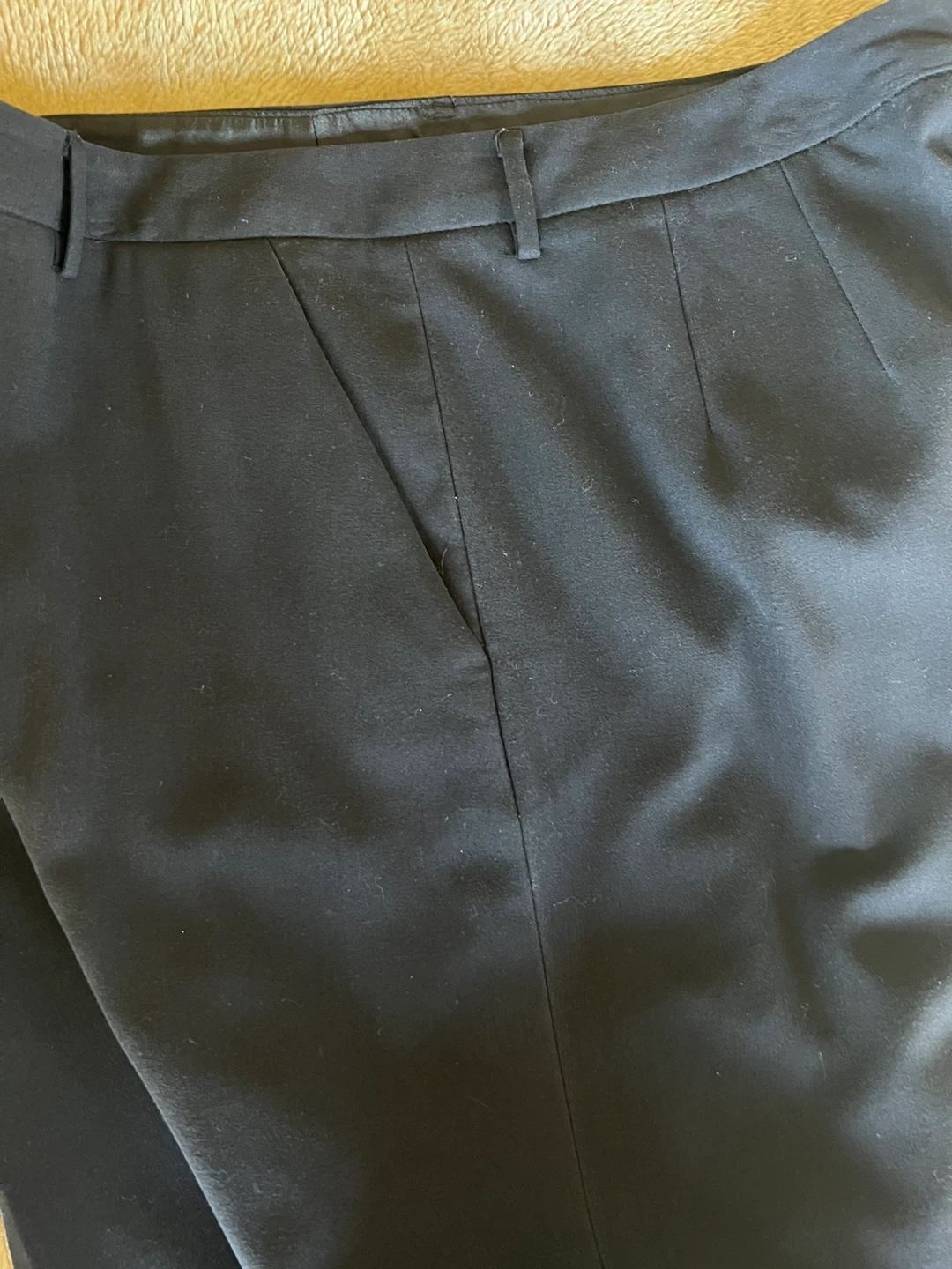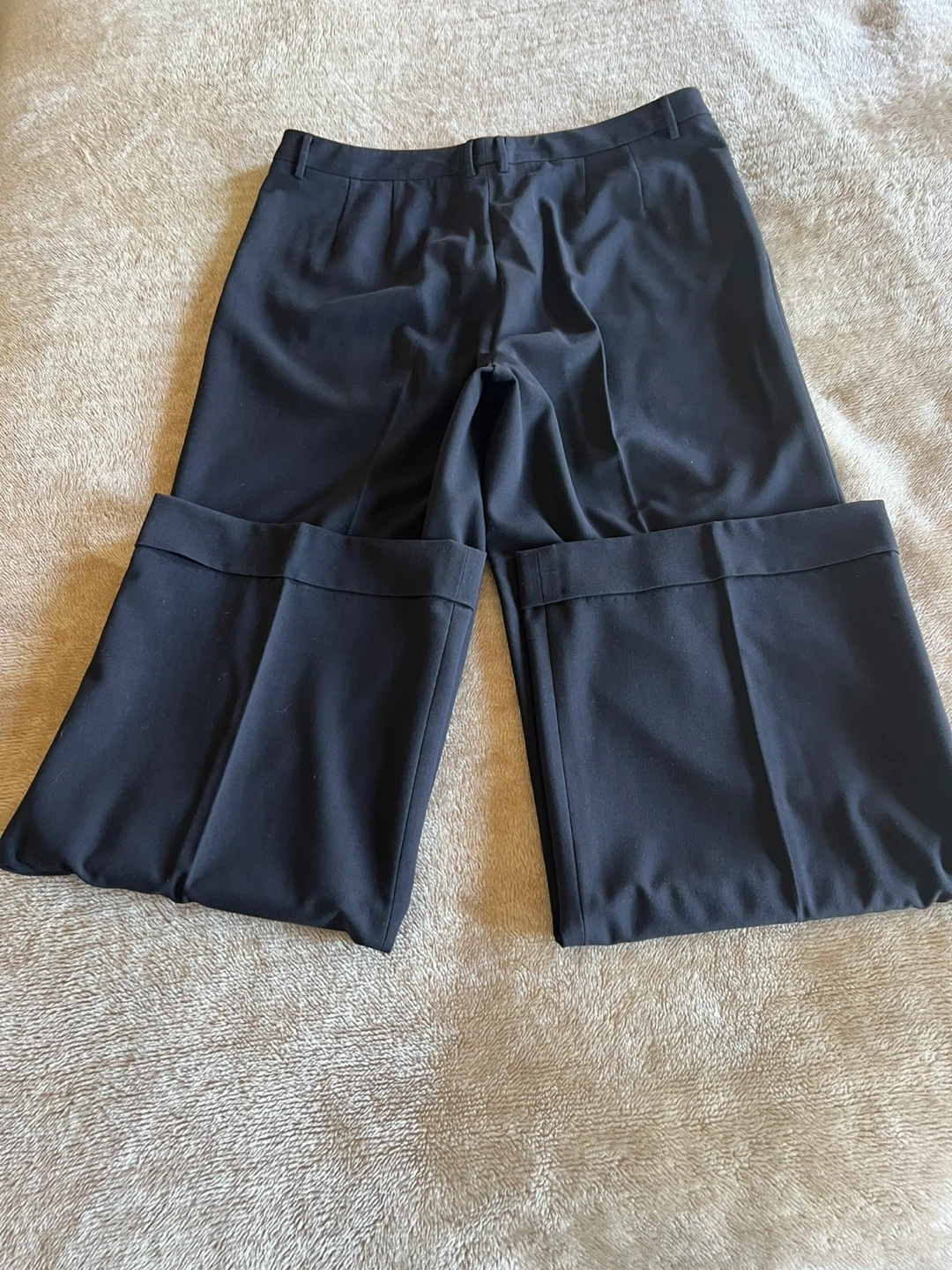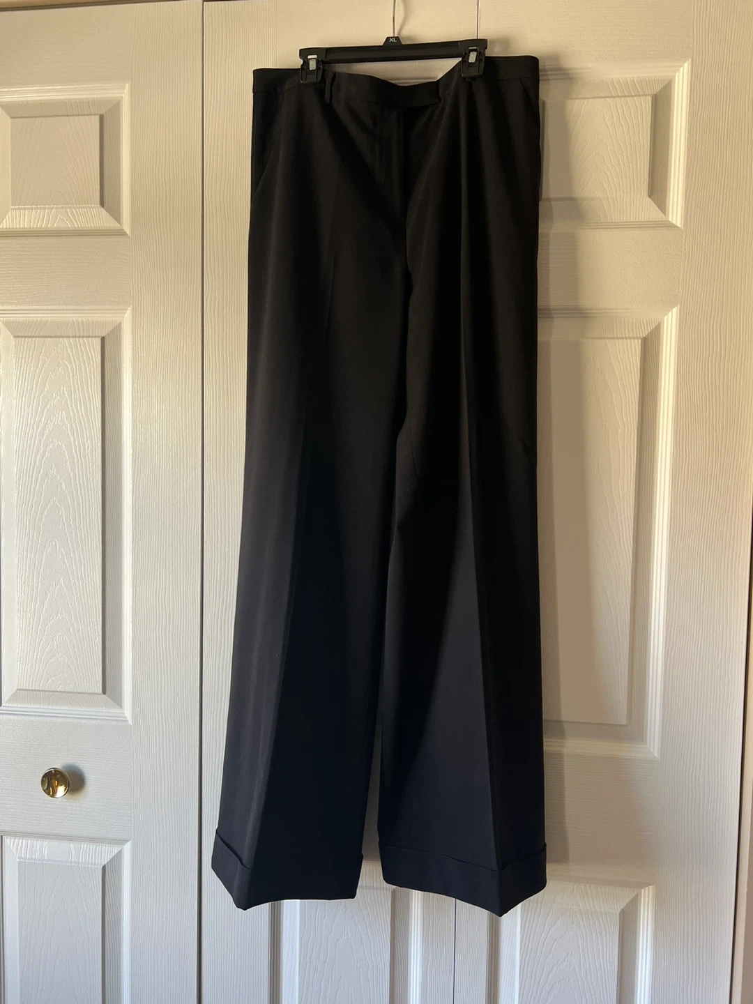 Classic black dress pants in a straight-leg cut. Made for everyday professional wear with a clean front and tailored finish. Comfortable waistband and neat hem create a polished look. Easy to pair with shirts and blazers for office or formal occasions. Can’t recall why there are no tags and no spot where they was initially attached. The slacks made from silk like fabric ( almost 100% sure it’s silk, mulberry 30mm). The look of the slacks is elegant. Don’t wrinkle with wear. Purchased from Sacks Fifth Avenue. Please pay attention to measurements, the fabric is not stretchy. I believe it will feet size 14/16. The side packets are still basted shut. Message me with any questions.