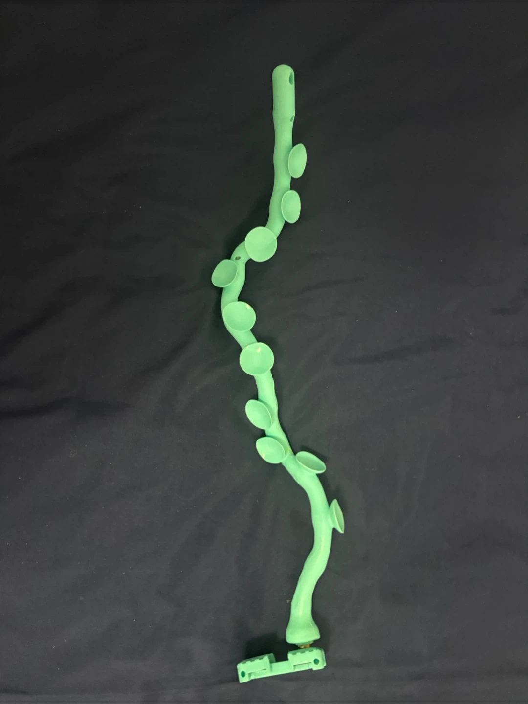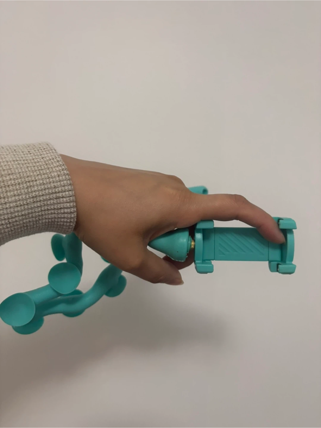 This flexible phone holder is designed to attach to various surfaces using its suction cups. It features a bendable arm and a clamp for securing your smartphone. The holder is a light green colour and made of a flexible material.
