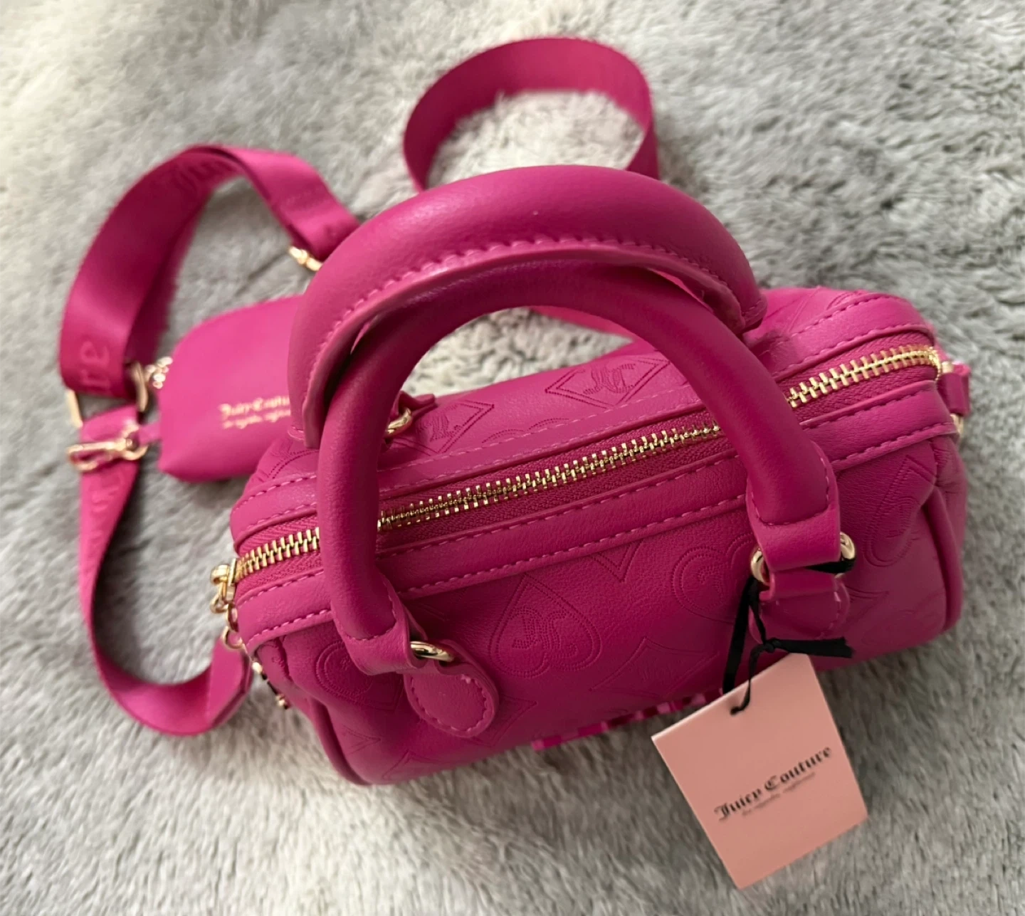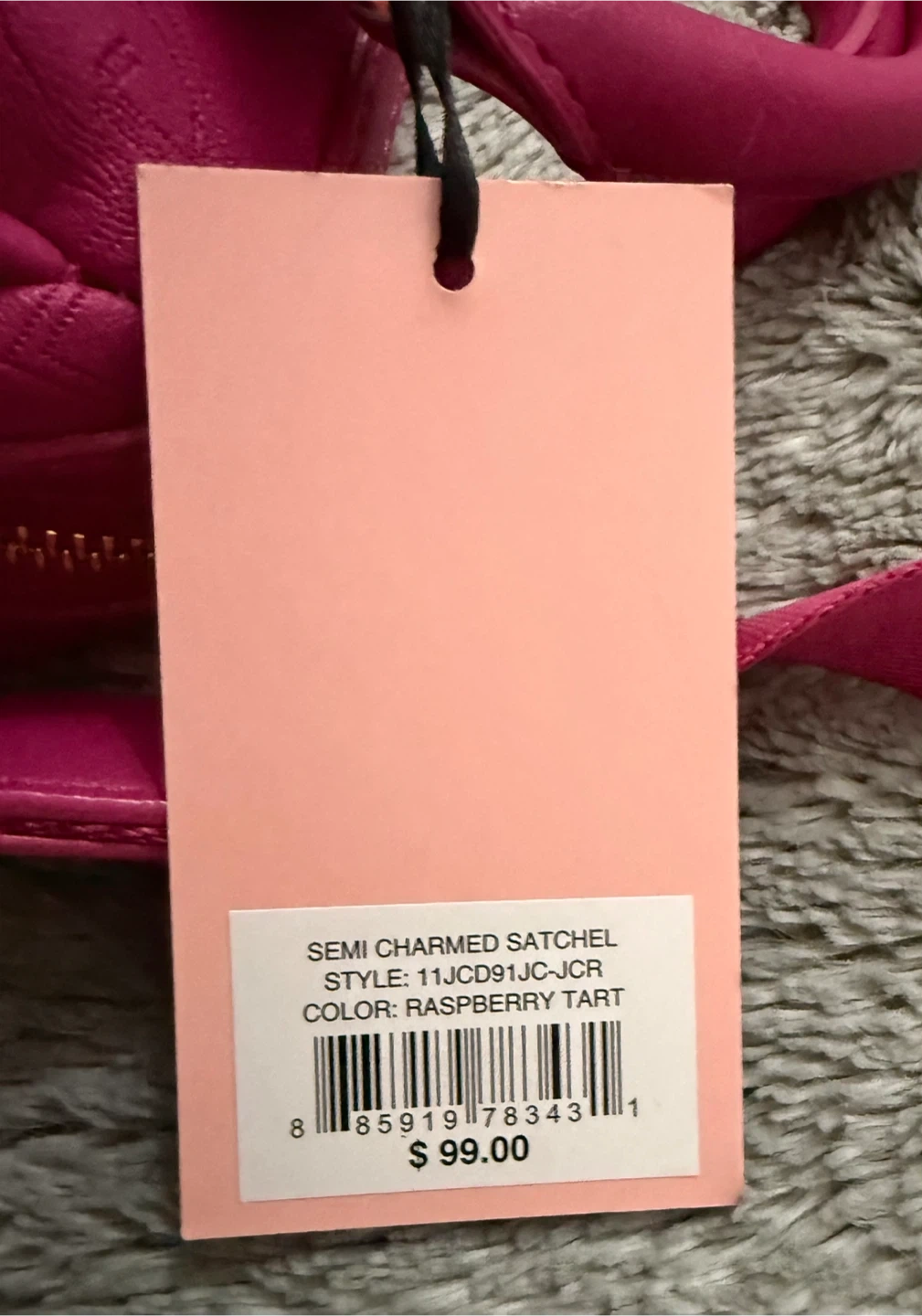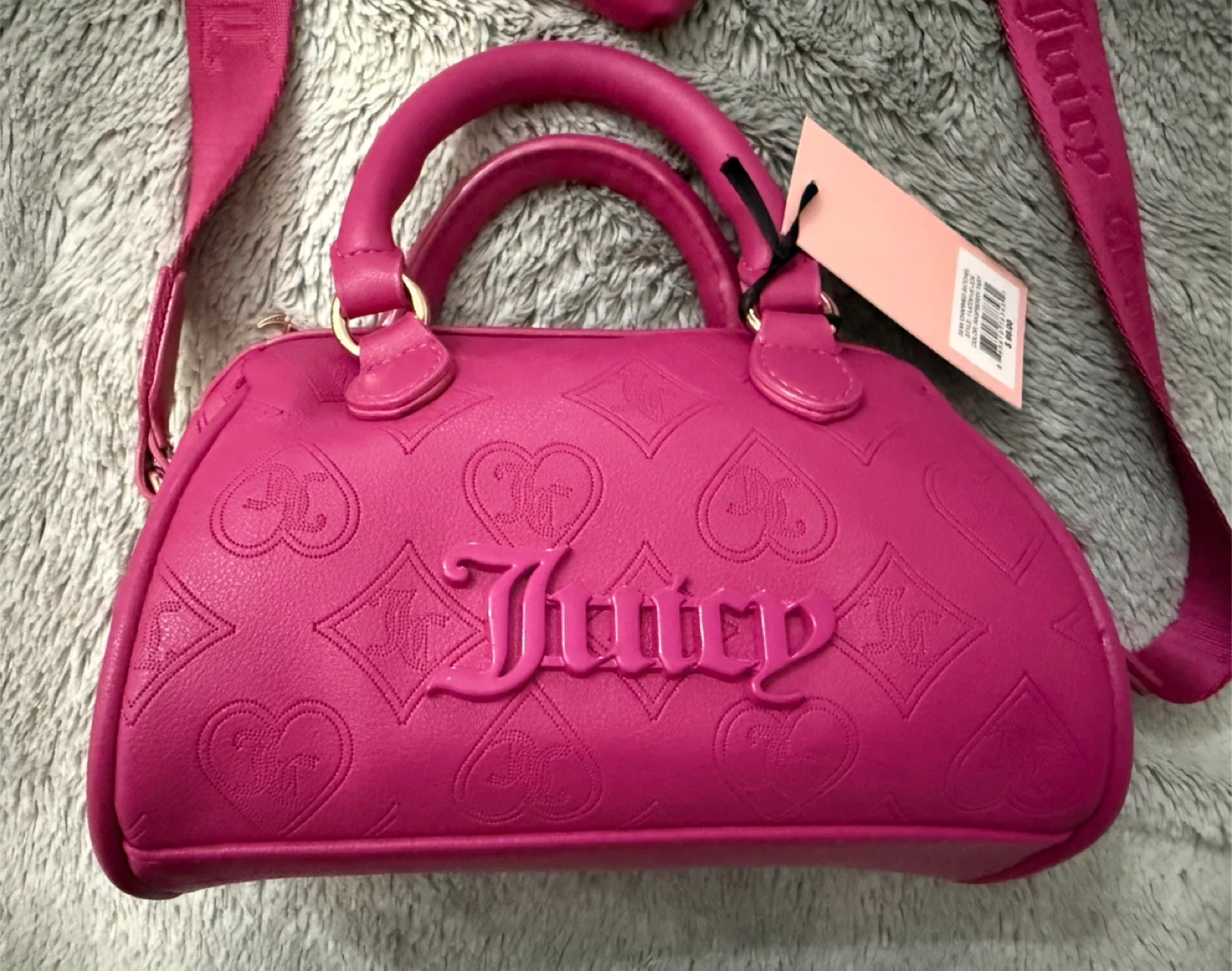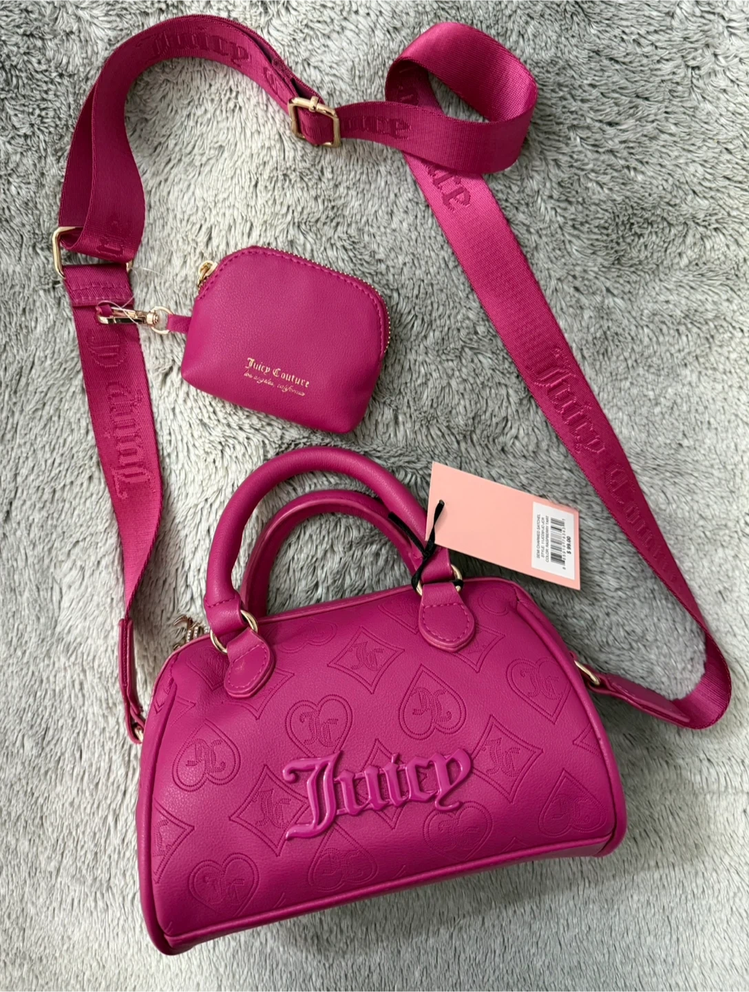 This is a Juicy Couture Semi Charmed Satchel in Raspberry Tart. It features an embossed Juicy Couture logo and heart pattern. A small matching coin purse is included, along with the original tag showing its retail price of $99.00. It's a stylish accessory for anyone looking to add a pop of colour!