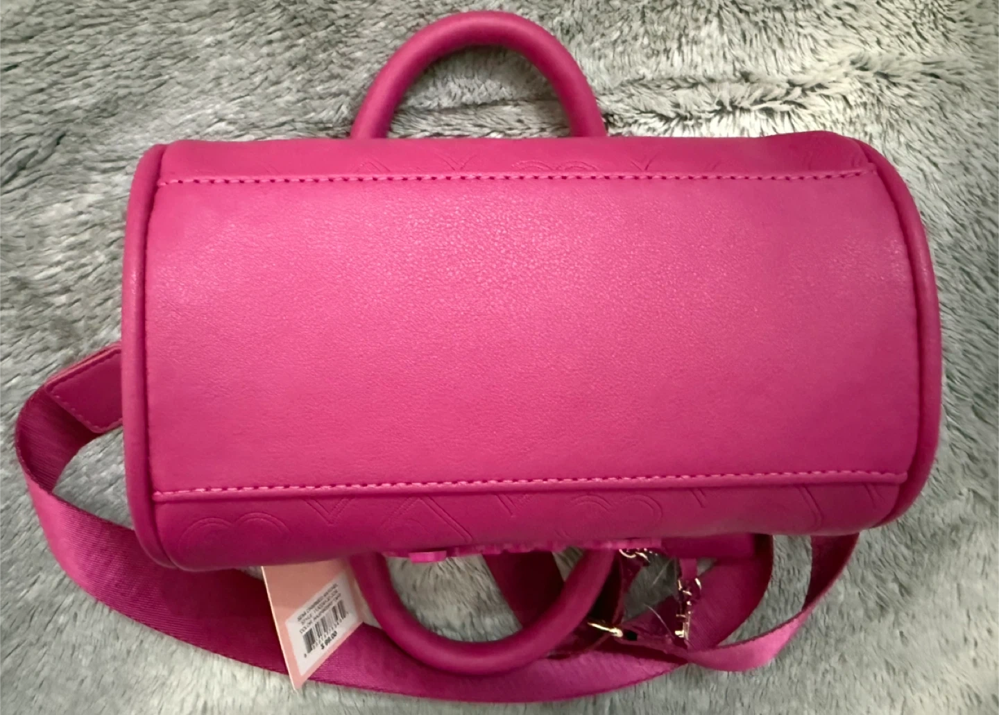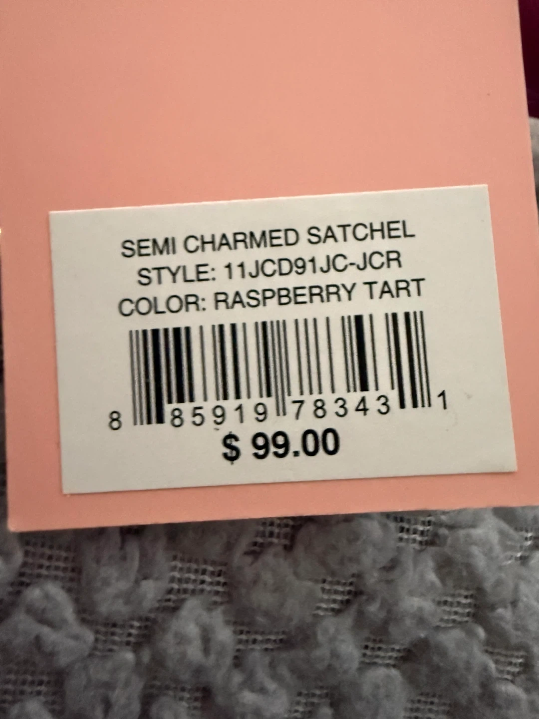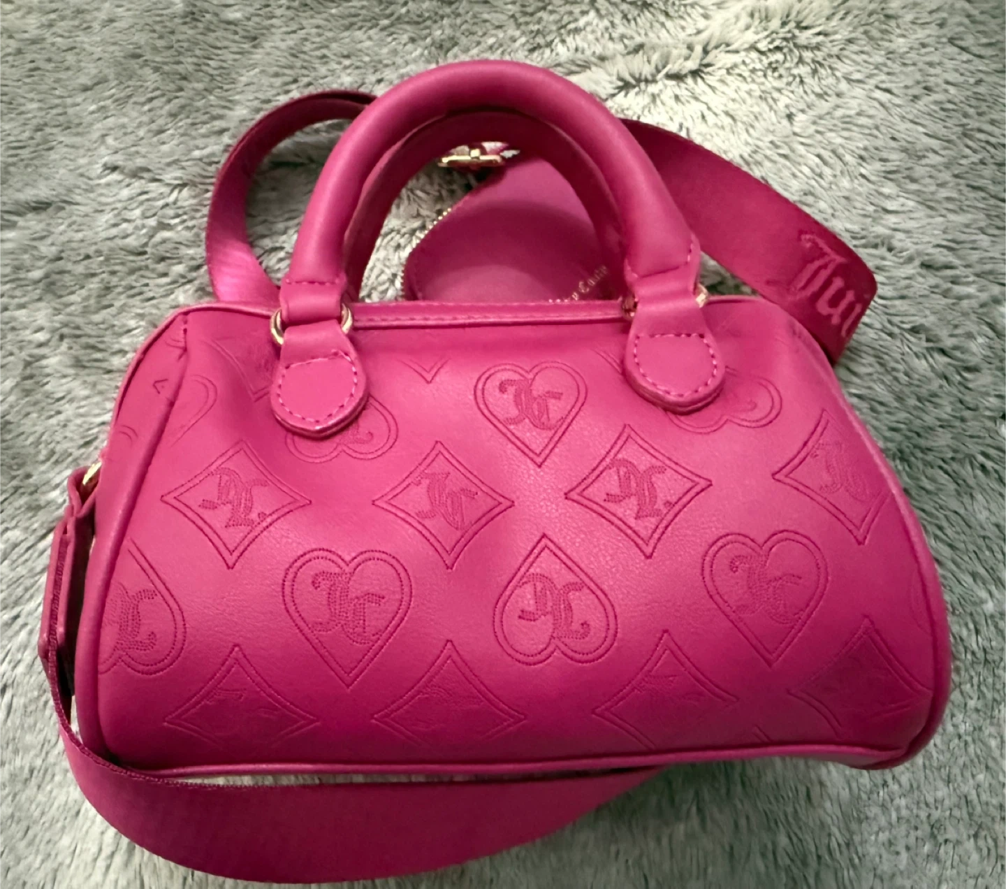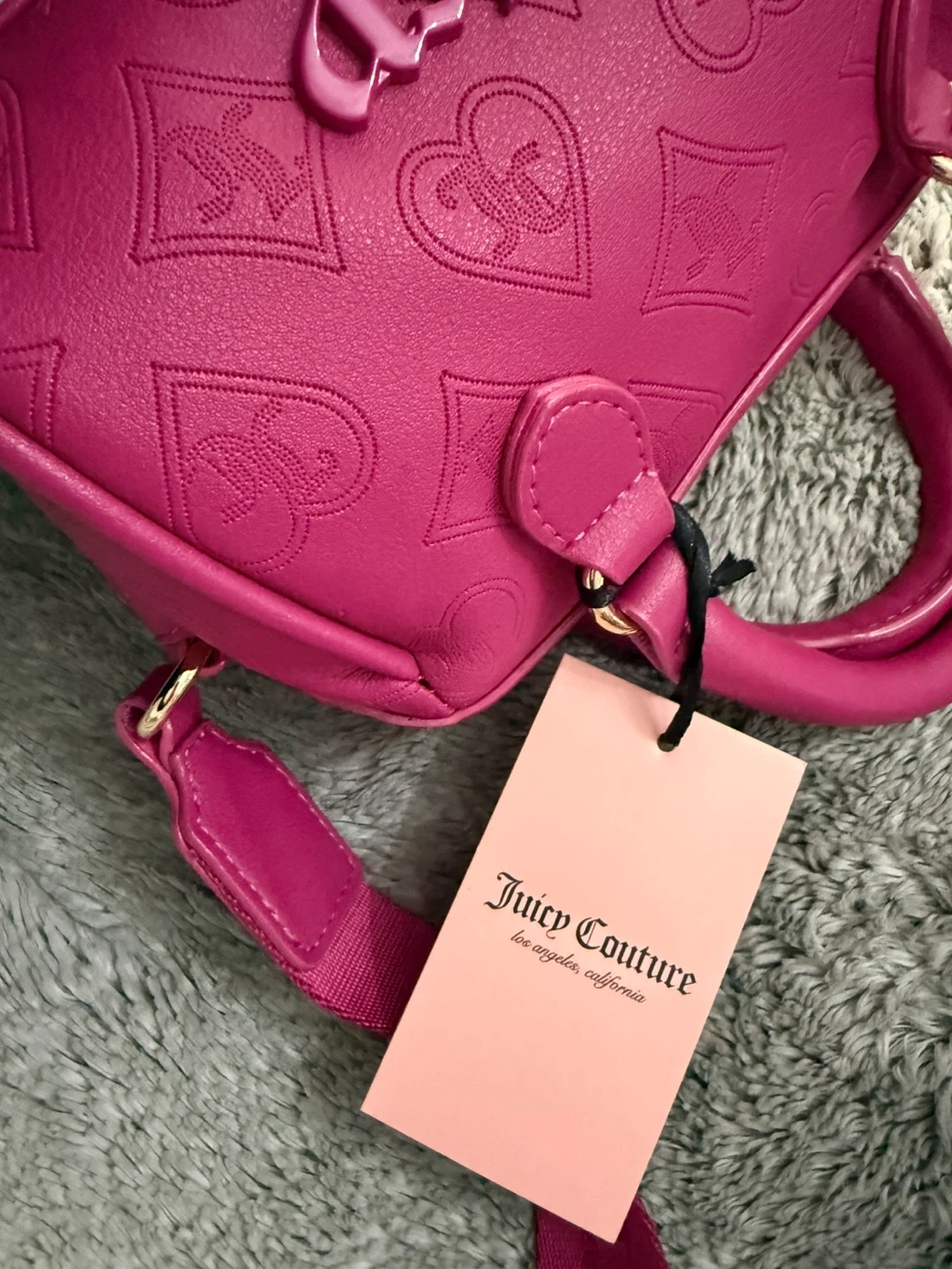 This is a Juicy Couture Semi Charmed Satchel in Raspberry Tart. It features an embossed Juicy Couture logo and heart pattern. A small matching coin purse is included, along with the original tag showing its retail price of $99.00. It's a stylish accessory for anyone looking to add a pop of colour!