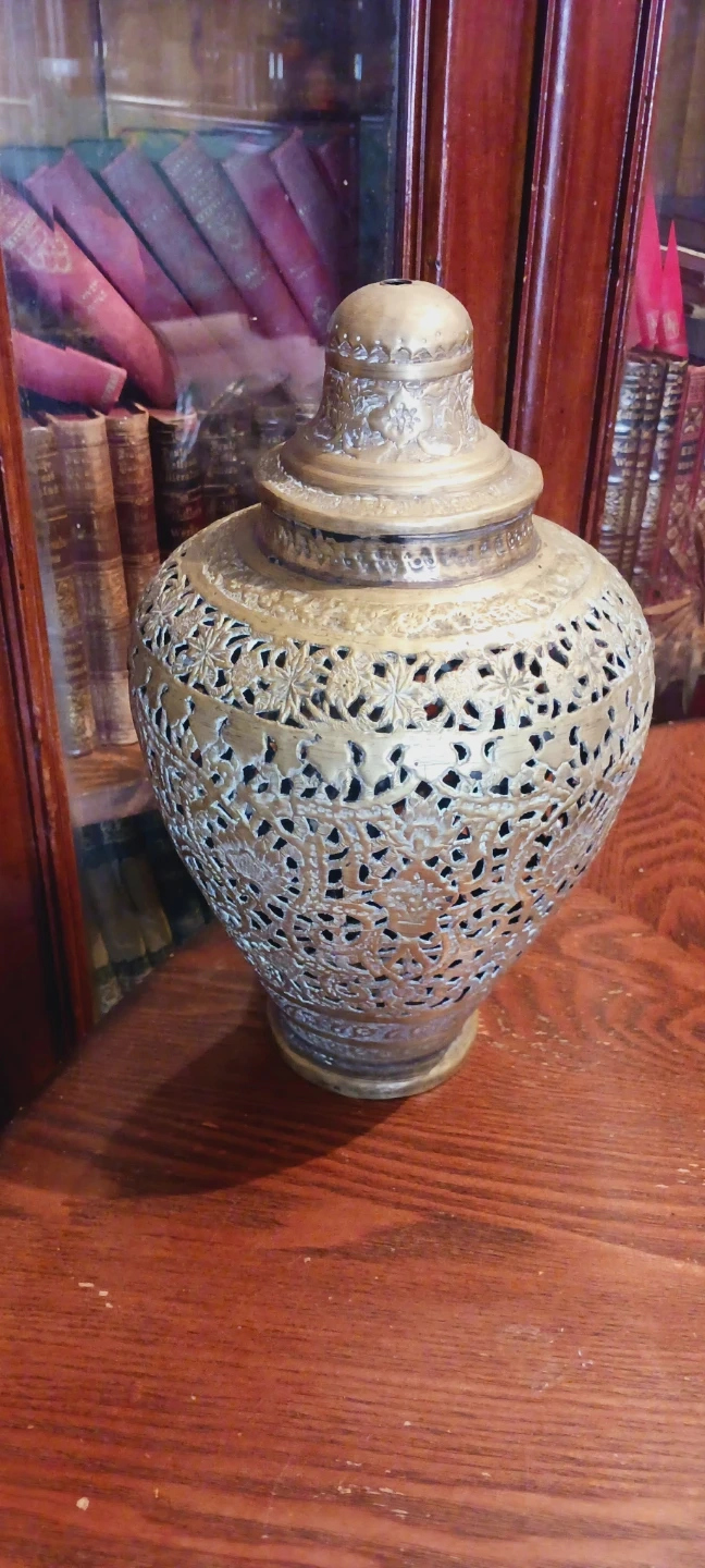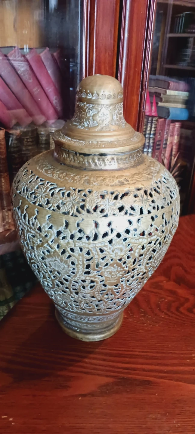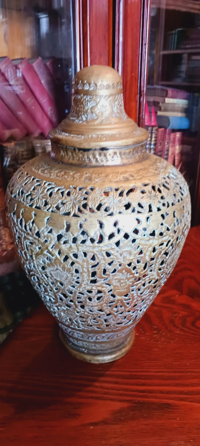 Beautiful Antique Ornate Indian Hindu/ Persian Large Pierced Brass Lided Vase/Jar. It features an intricate filigree design with floral and leafy motifs. The vase includes a matching lid. It's a beautiful piece for home decor!!! 13"×8". Good vintage condition. ALL MY PRICES ARE NEGOTIABLE !!