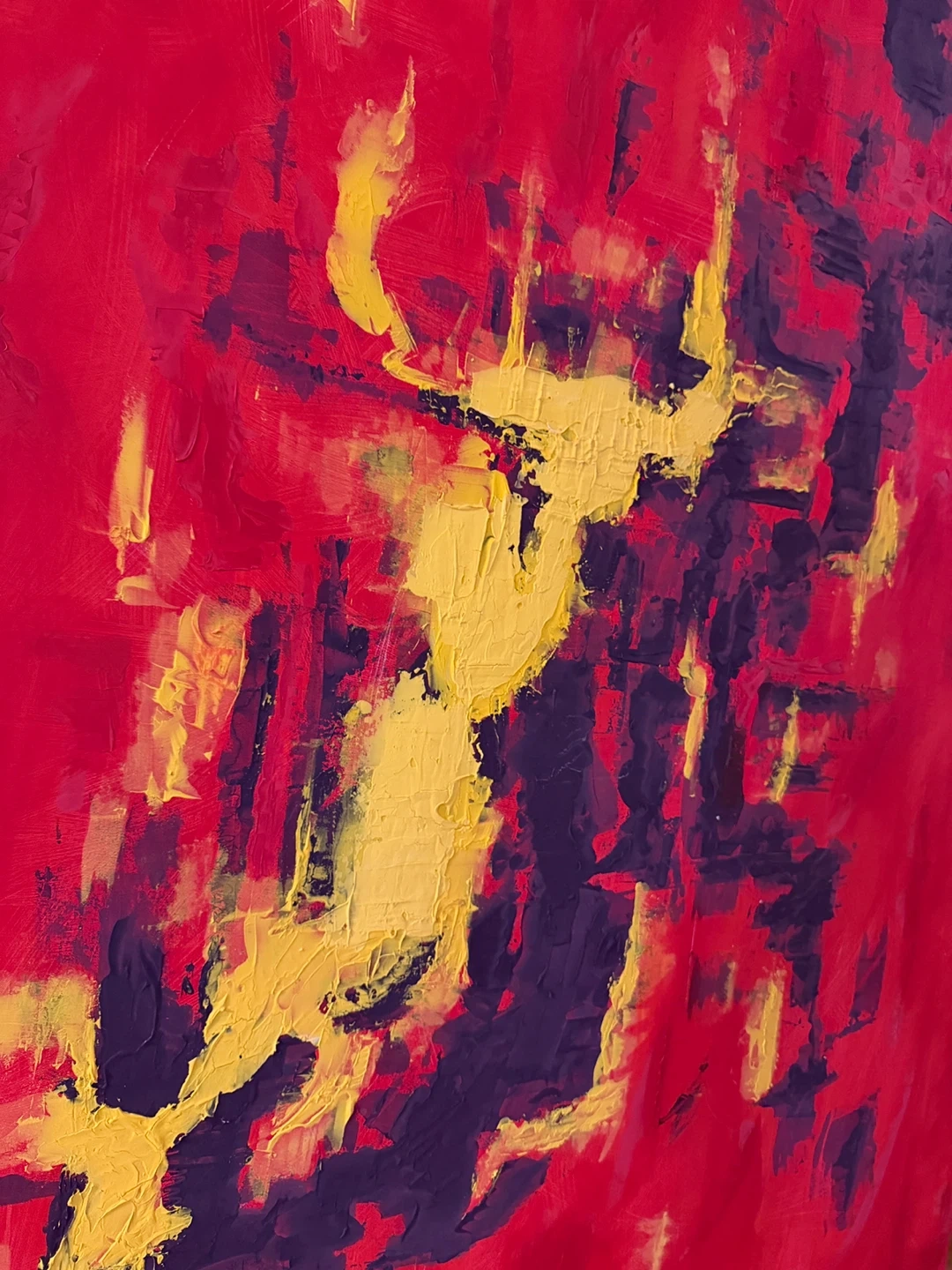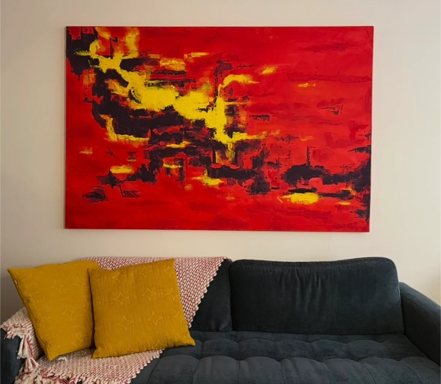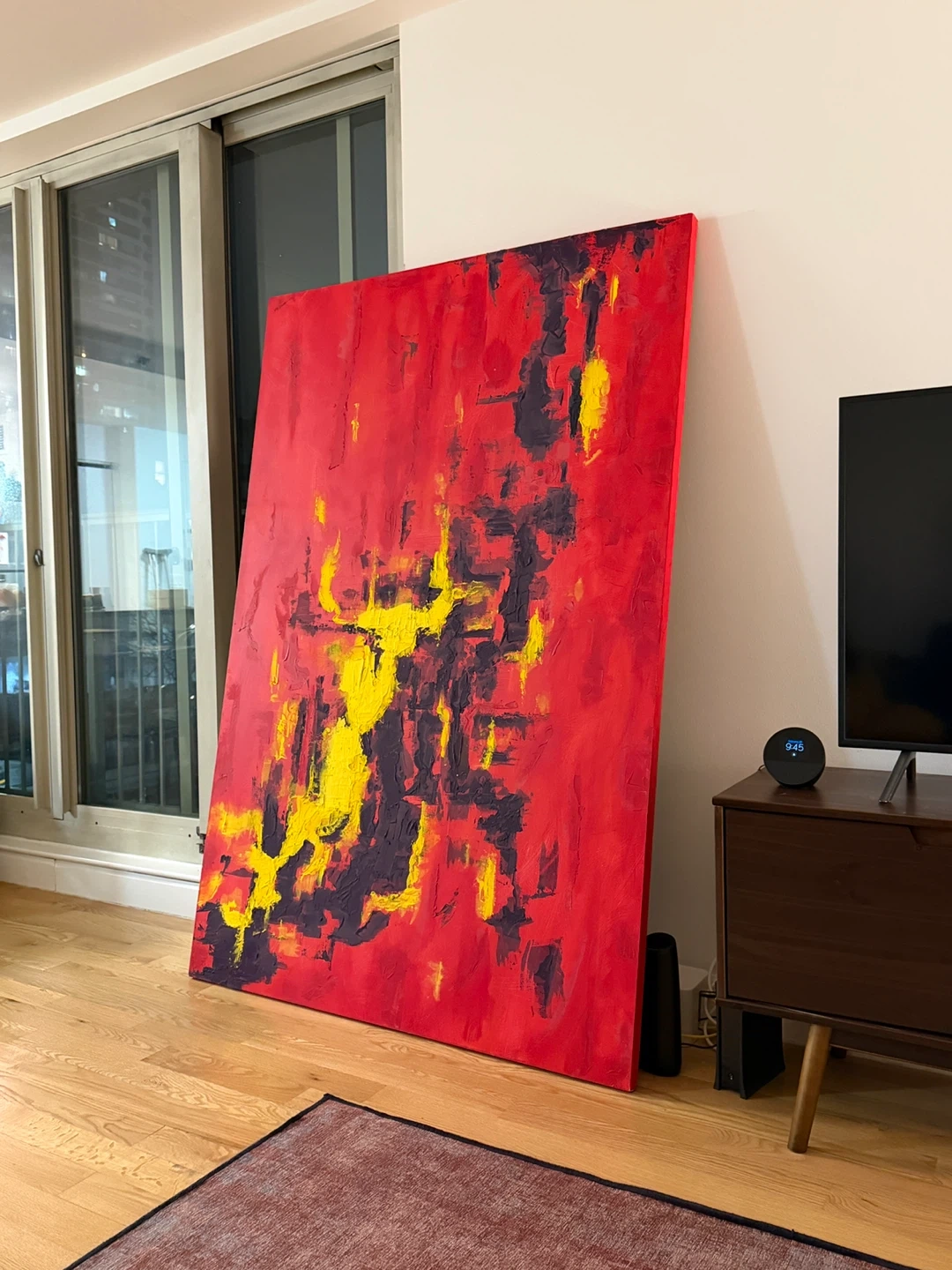 This is a large abstract painting featuring bold strokes of red, yellow, and black. It's a striking piece that adds a vibrant pop of color to any room. The textured surface gives it depth and visual interest.
