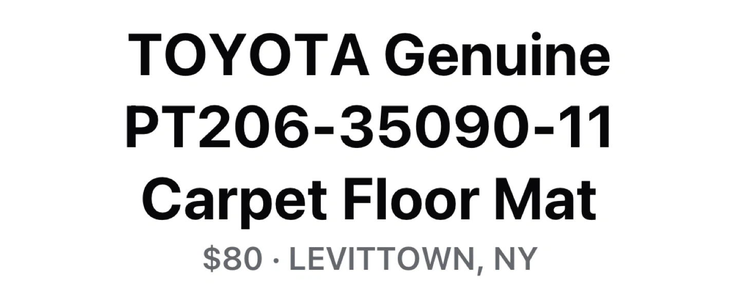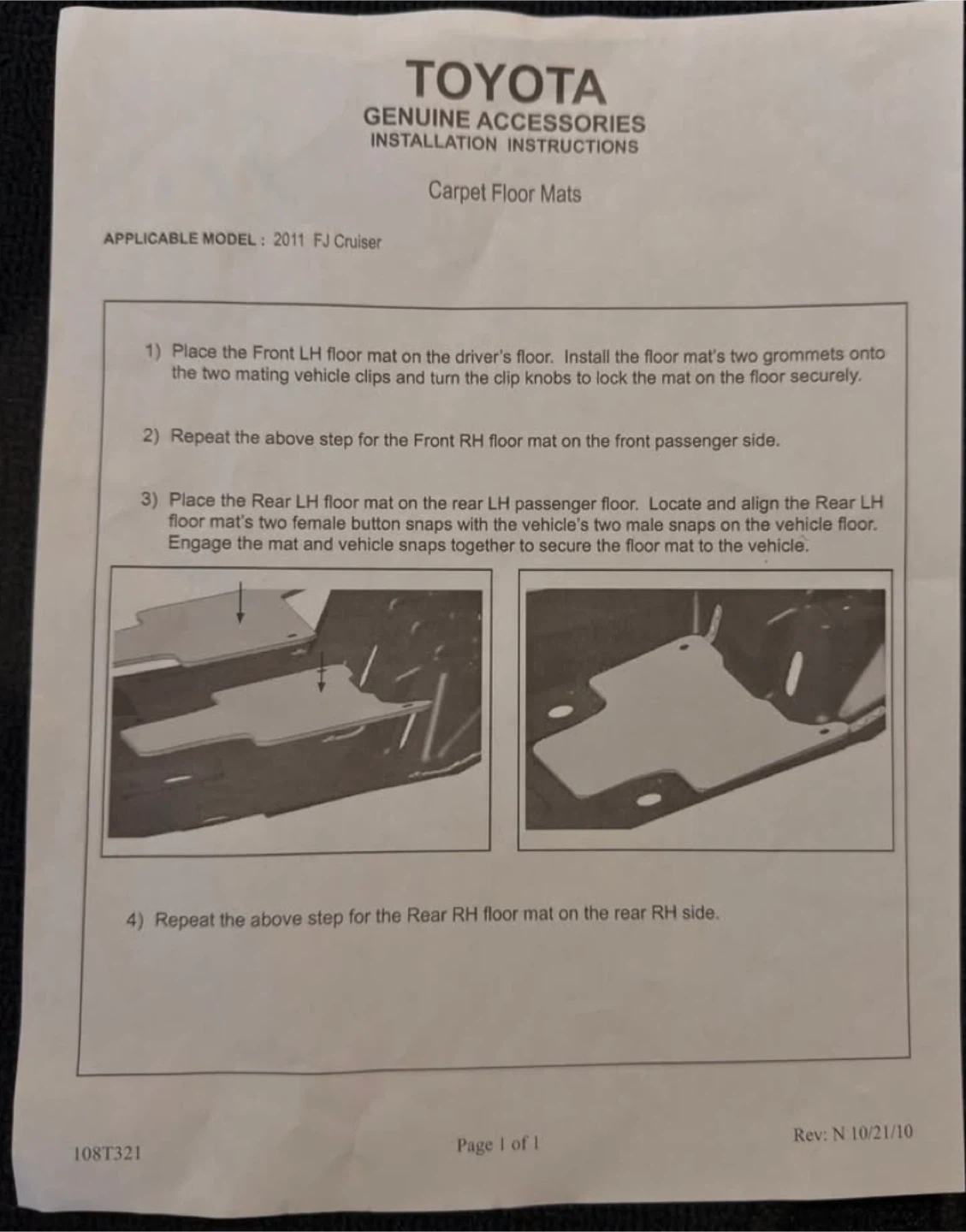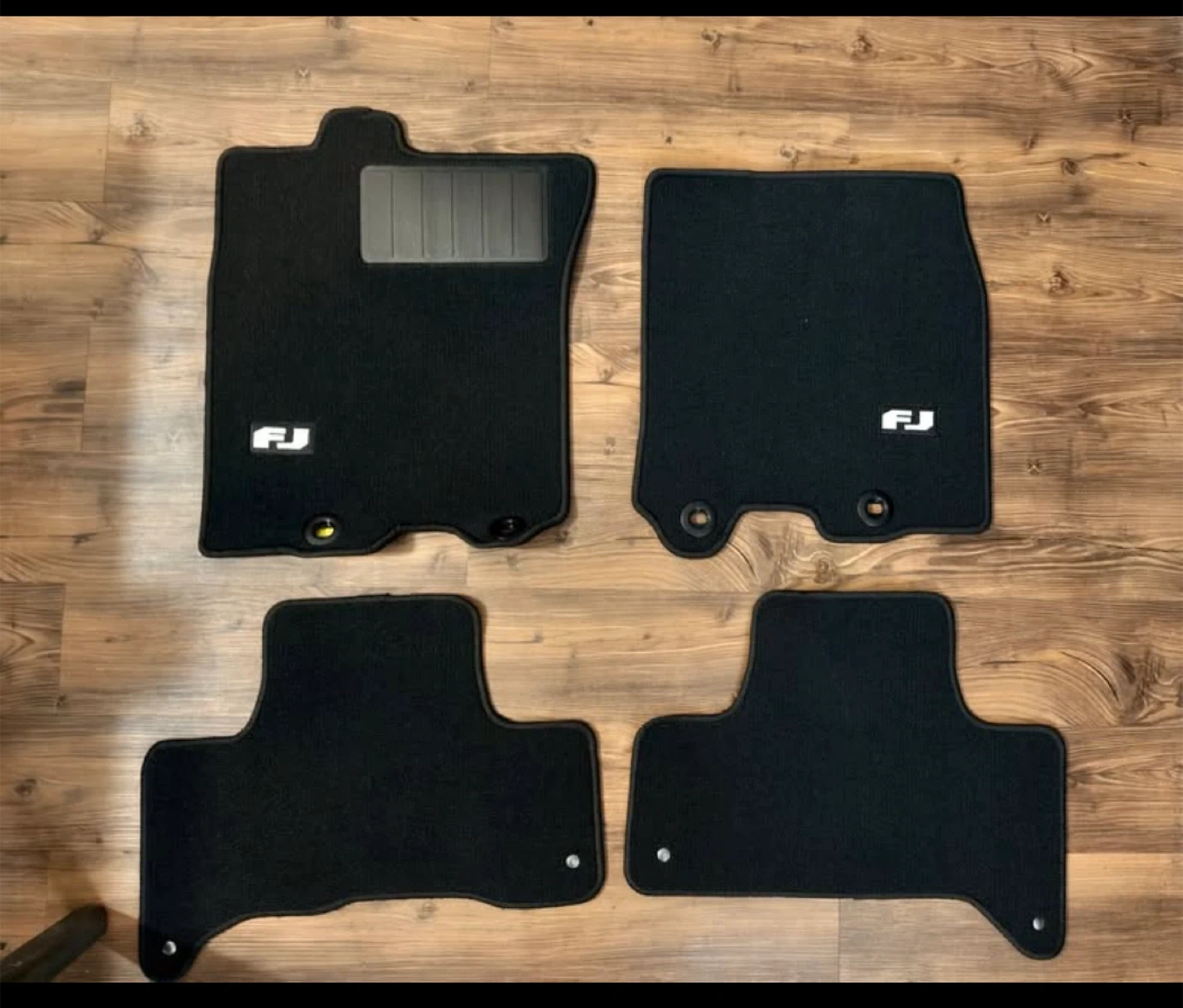 This is a set of four TOYOTA genuine carpet floor mats for a 2011 FJ Cruiser. They're black with FJ logos. Includes front and rear mats. Only looking for $80 however for some reason I cannot emery this amount